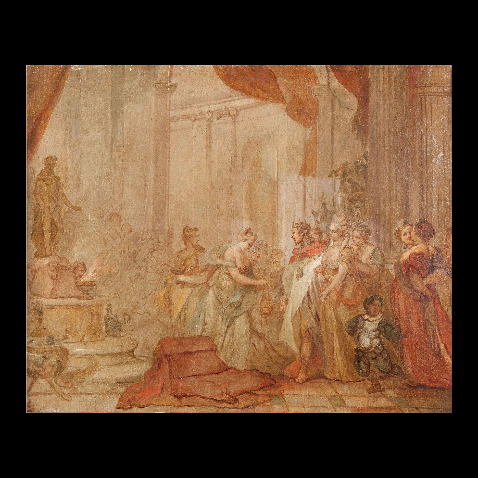 Vittorio Maria Bigari (Bologna 1692 - 1776), Salomone e la Regina di Saba Pubblicazioni: A. Emiliani, in 'Bozzetti, Modelletti, Sketches dalla collezione Giorgio Baratti', a cura di A. Orlando, A. Scarpa, Genova, 2022, pp. 14-15. Olio su tela, dimensioni 46x57 cm.