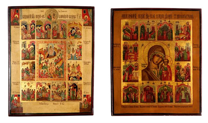 Lotto composto da due icone russe, raffiguranti soggetti sacri, epoca XX secolo.