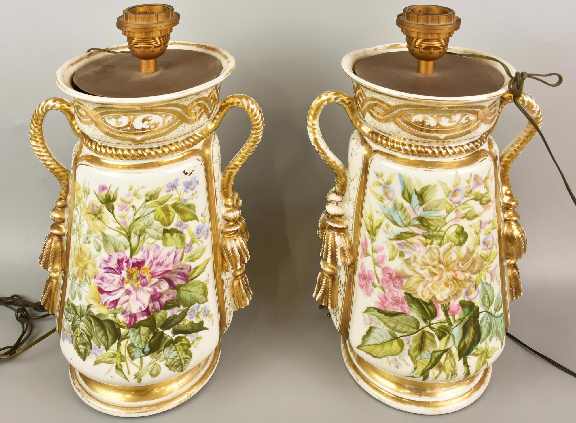 COPPIA DI LAMPADE IN CERAMICA con decorazioni floreali e in oro zecchino h...