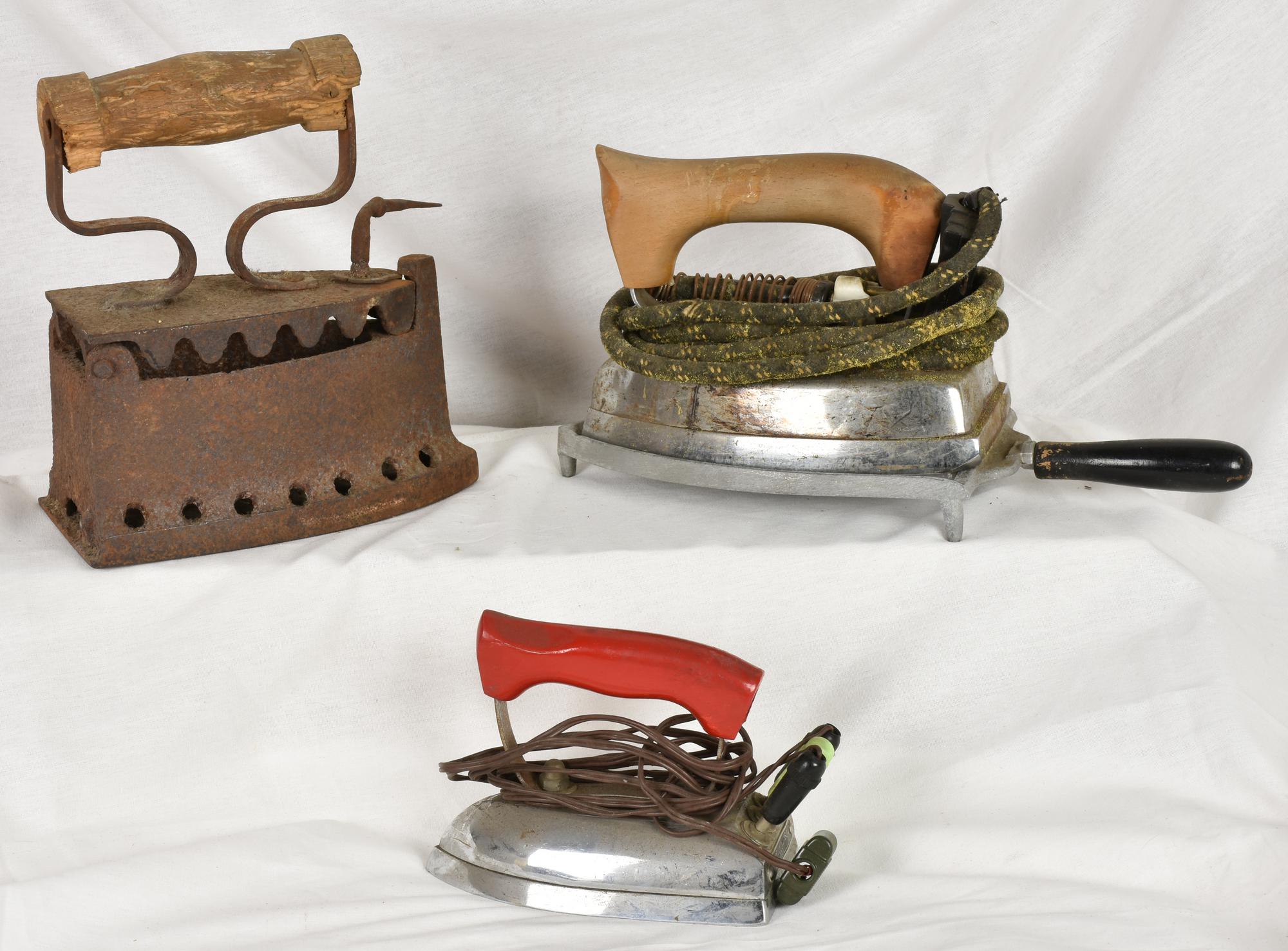 LOTTO DI TRE FERRI DA STIRO - in ghisa con manico di legno Italia meta' 800...