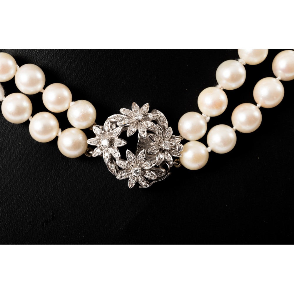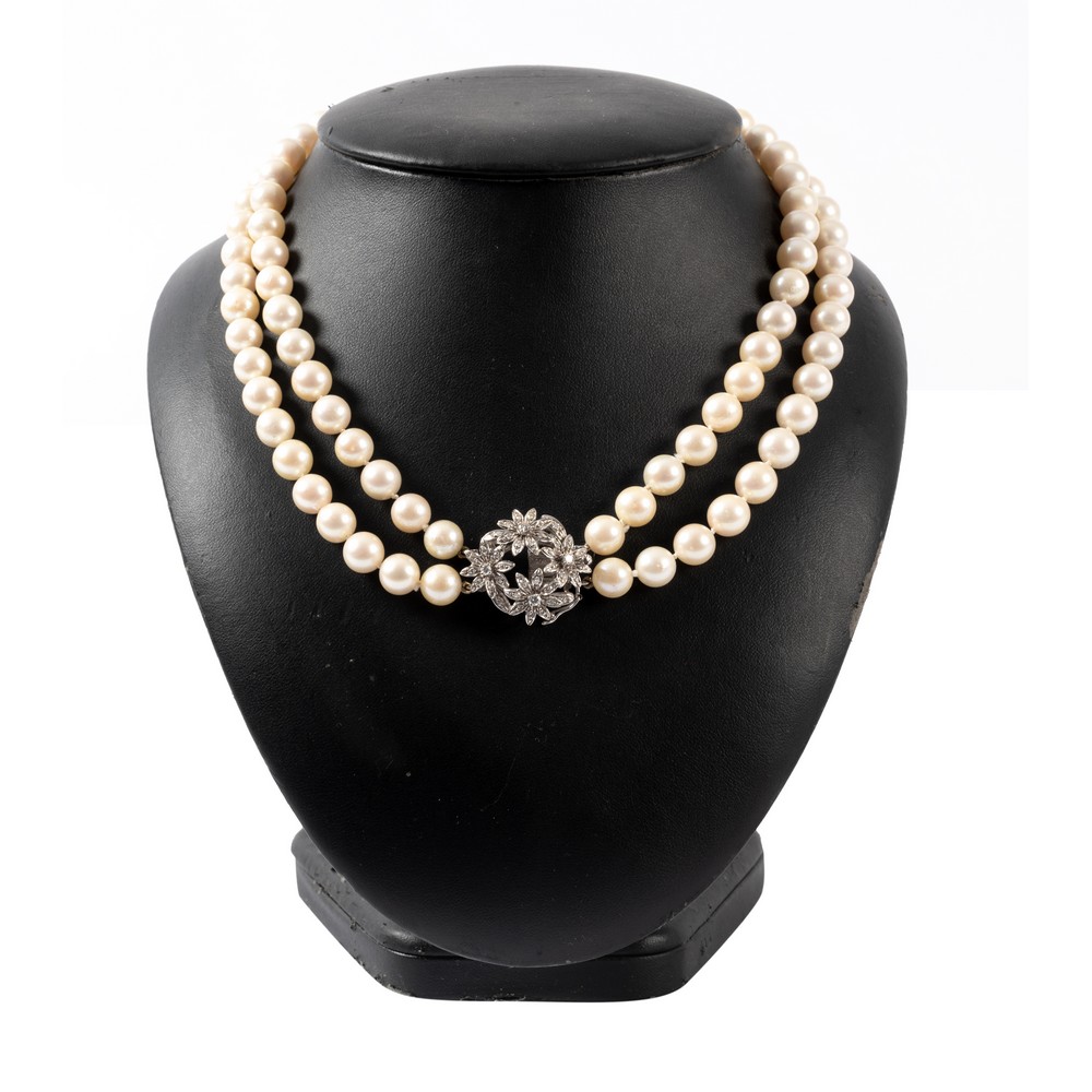 COLLANA a due fili di perle coltivate Giappone con susta in oro bianco 18 KT e diamanti taglio brillante ct. 0,08 I color VS2 e diamanti taglio huit/huit ct. 0,35 (g. 77,80).