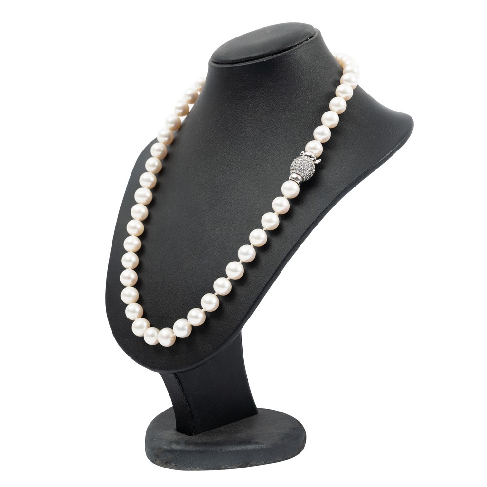 Collana di perle coltivate Giappone mm. 9,5/10 con susta in argento 925 e zaffiri bianchi e collana con sfere in onice e corallo.