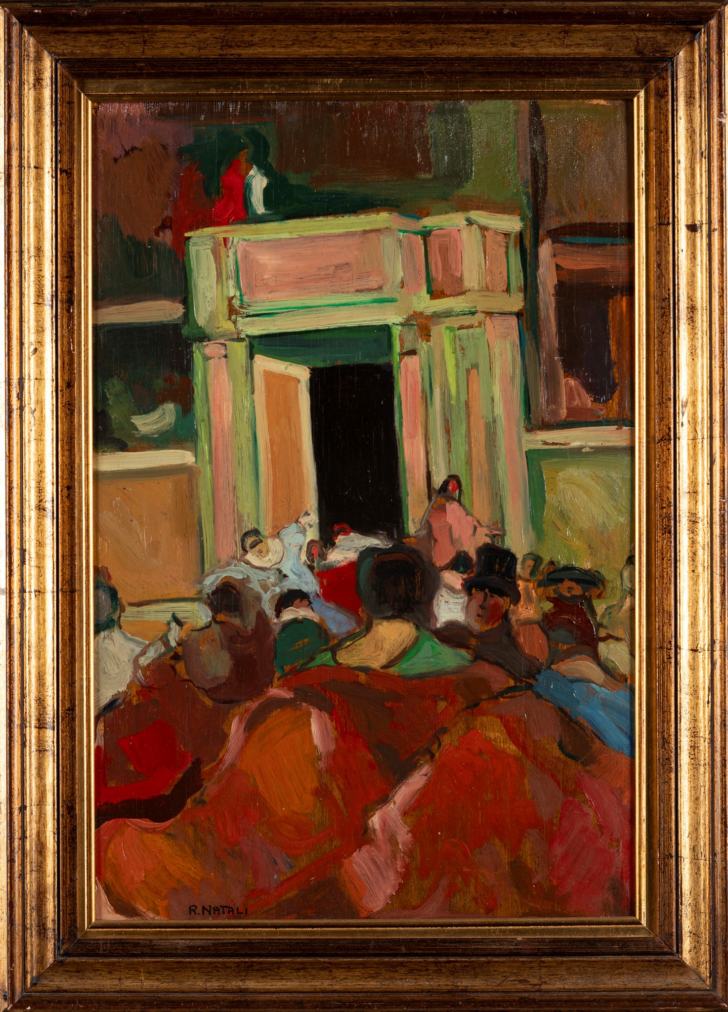 al retro, sul supporto, firmato, titolato e datato a matita: RENATO NATALI / VEGLIONE AL TEATRO GOLDONI / 1927;  traccia di vecchia etichetta