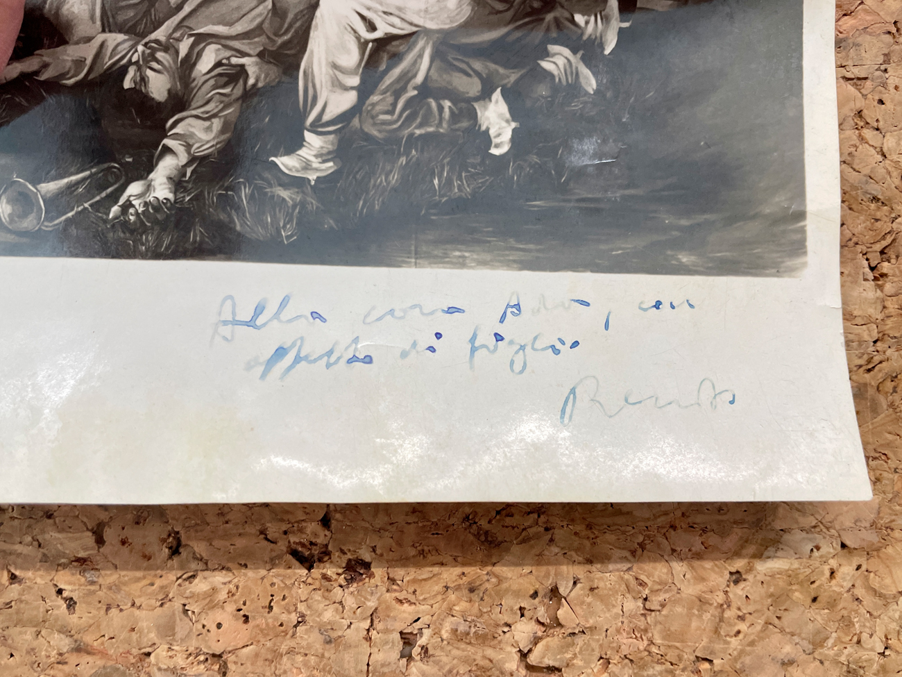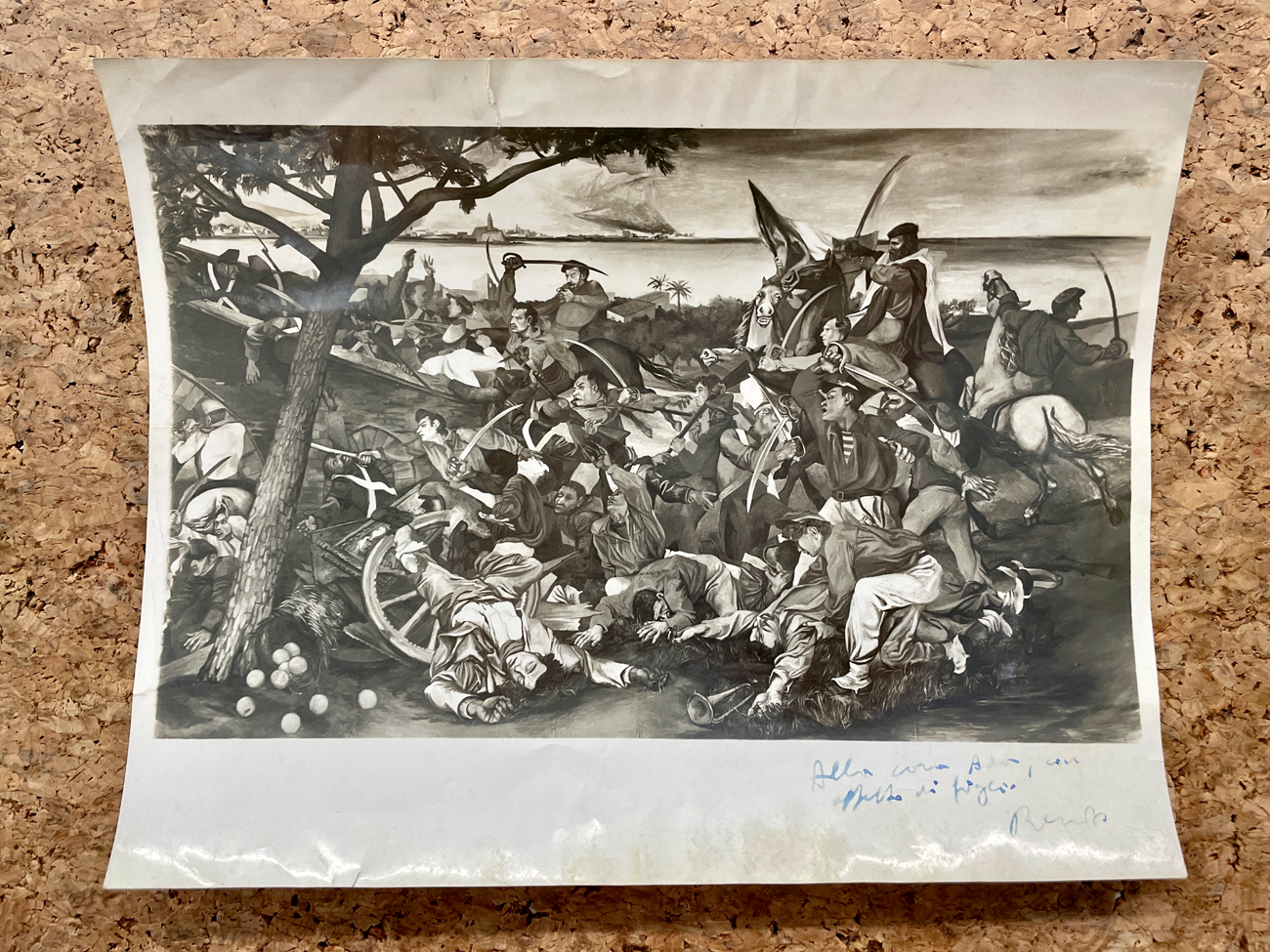 Reca all'interno una fotografia in bianco e nero del dipinto 'Battaglia di Ponte dell'Ammiraglio' recante firma e dedica dell'Artista