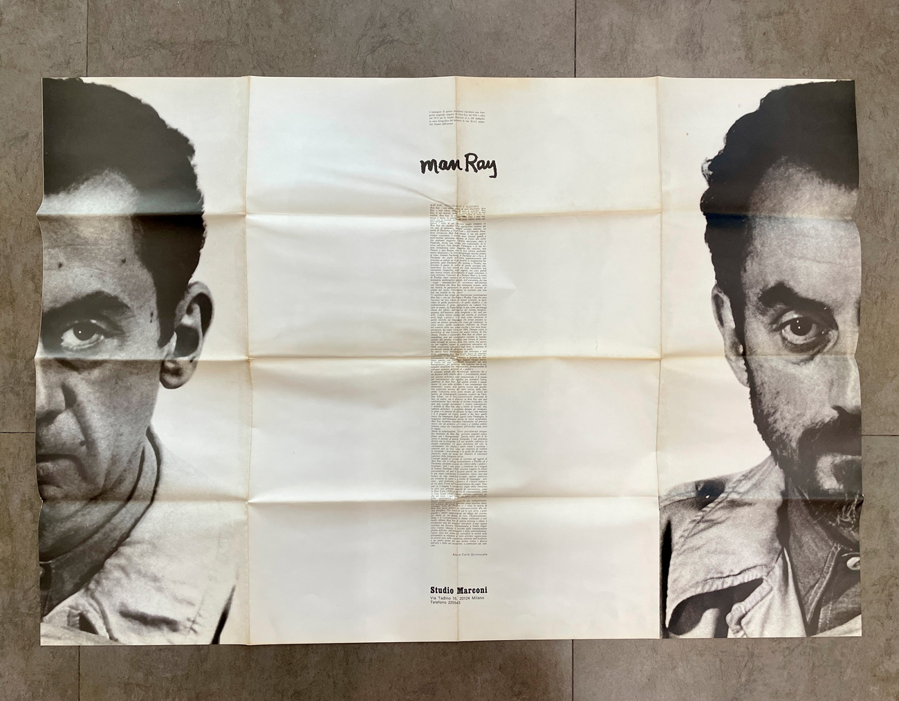 Pieghevole - manifesto illustrato recante testo di Arturo Carlo Quintavalle al fronte e riproduzione della fotografia originale eseguita da Man Ray nel 1943 e edita nel 1974 per lo Studio Marconi, Milano, in 100 esemplari firmati su carta fotografica cm 18x13