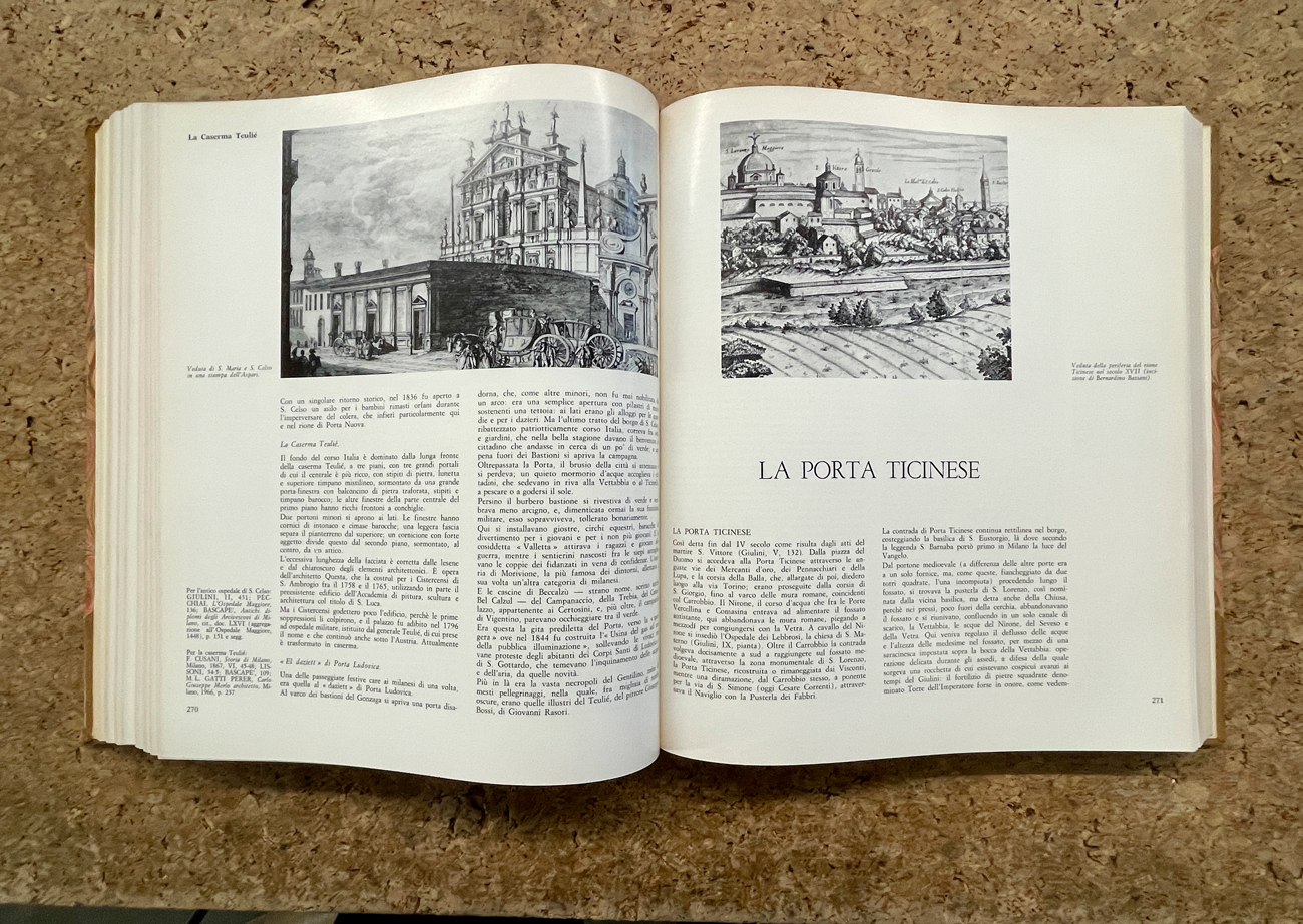 Il volume presenta 12 tavole a colori nel testo, che raffigurano i circondari delle sei Porte della città nel 1784 circa e nel 1869; ad ogni tavola é sovrapposta la pianta del medesimo settore cittadino nelle condizioni presenti