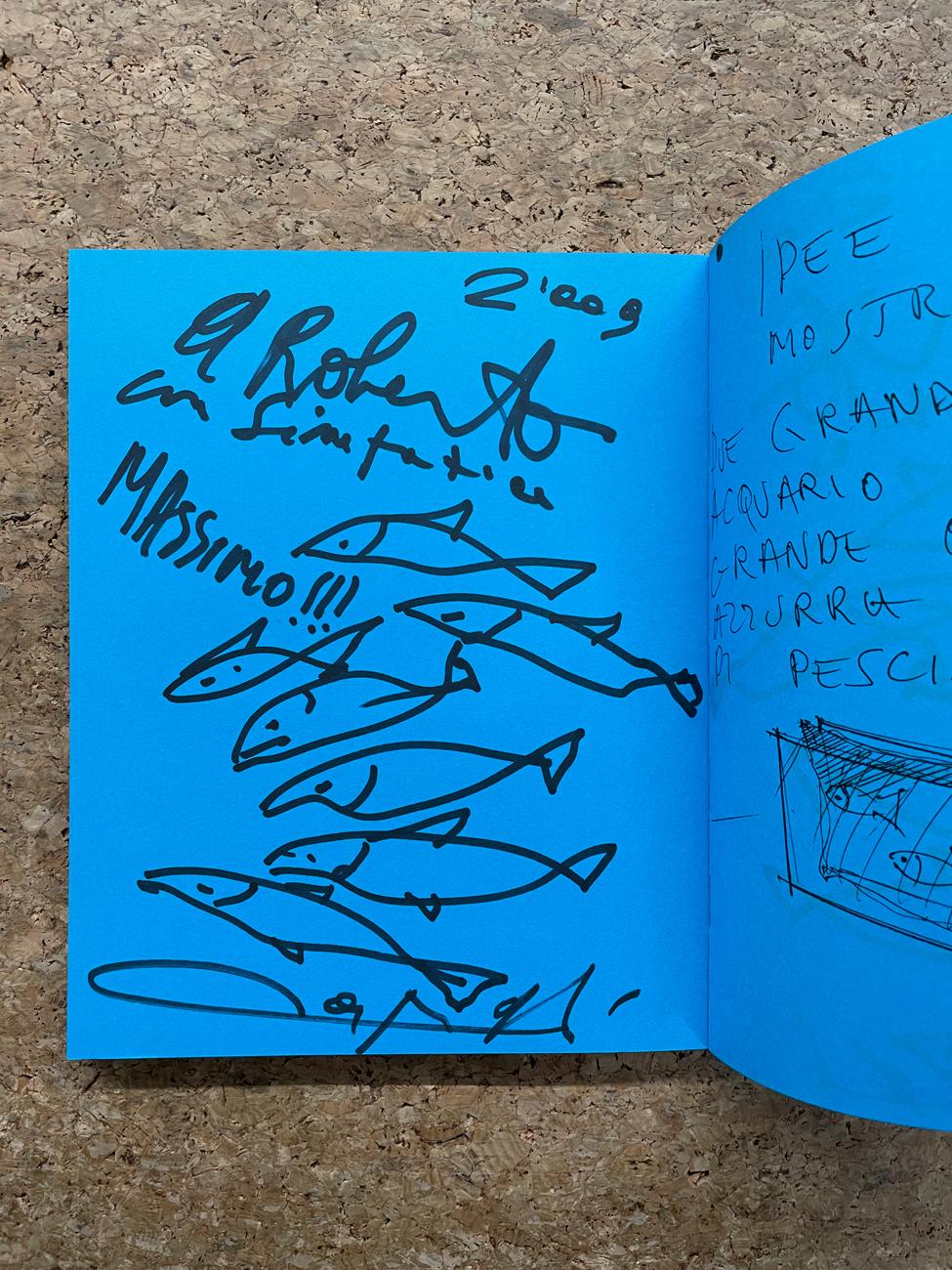 Reca disegno dell'Artista a pennarello nero, firmato, datato (2009) e dedicato, all'interno