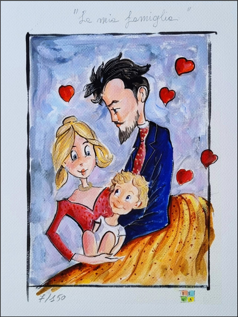 FENA Lecce 1958 "La mia famiglia" Serigrafia su cartoncino pesante, ritoccata a mano, cm 24x32. Firmata a penna in basso a destra, tiratura a matita 7/150, a sinistra, titolo in alto al centro.
