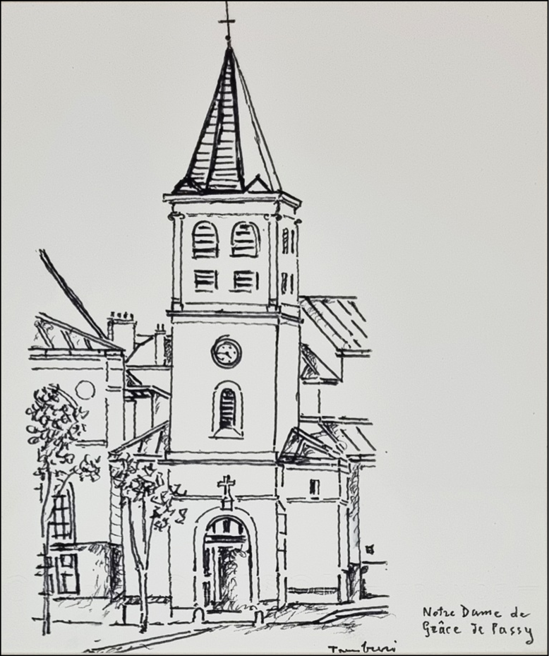 TAMBURI ORFEO Jesi 1910 - Parigi 1994 "Notre Dame de Grace je Passy" Pennarello su cartoncino cm 23x31, corredato di passepartout. Firmato ed intitolato sul fronte in basso a destra. Autentica su foto a cura del maestro.