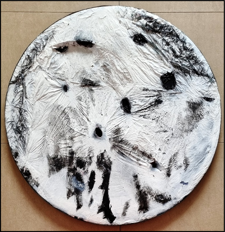 CROTTI DALILA Italia 1983 "Burnt 12" Acrilico su plastica e pelle cm 100 di diametro del 2015. Sul retro firma, data, tecnica, misure ed archiviazione a cura dell'artista. Archivio su foto a cura dell'artista.