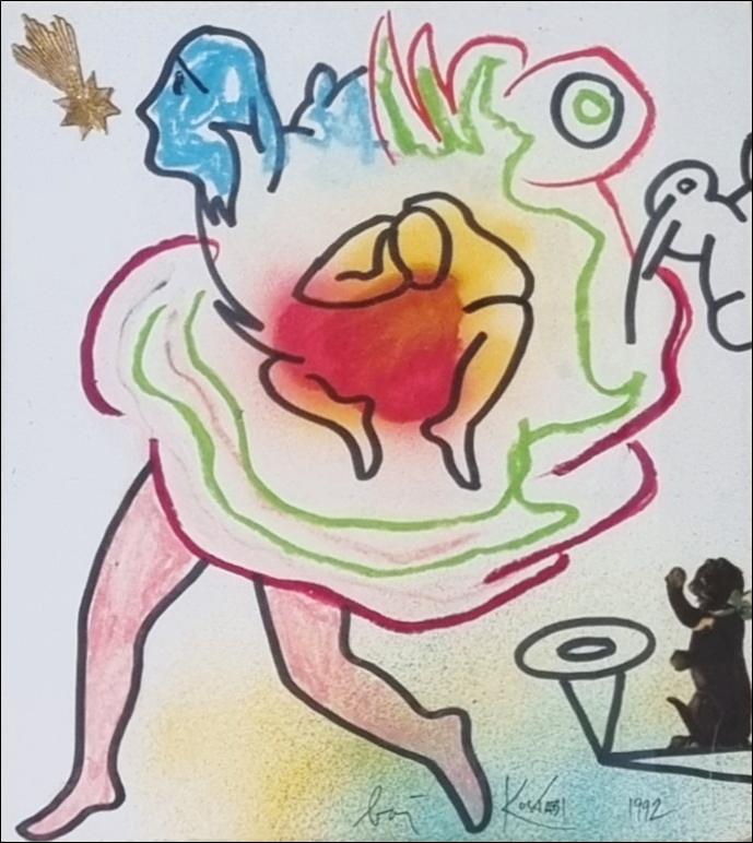 BAJ ENRICO e KOSTABI MARK "Impronta" Tecnica mista e collage su cartone applicato su masonite, cm 23,5x26 del 1992. Opera realizzata a 4 mani con Mark Kostabi. Firmata e datata sul fronte in basso a destra. Autentica su foto a cura del gruppo Editoriale Fabbri SpA.