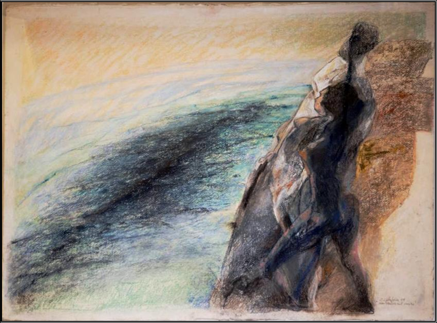 CALABRIA ENNIO Tripoli 1937 "Un'ombra sul mare" Olio su cartone cm 80x60 del 2008. Firmato, datato ed intitolato sul fronte in basso a destra. Autentica su foto a cura dell'artista, timbro della Galleria "La Sfinge" di Mauro Borgiani.