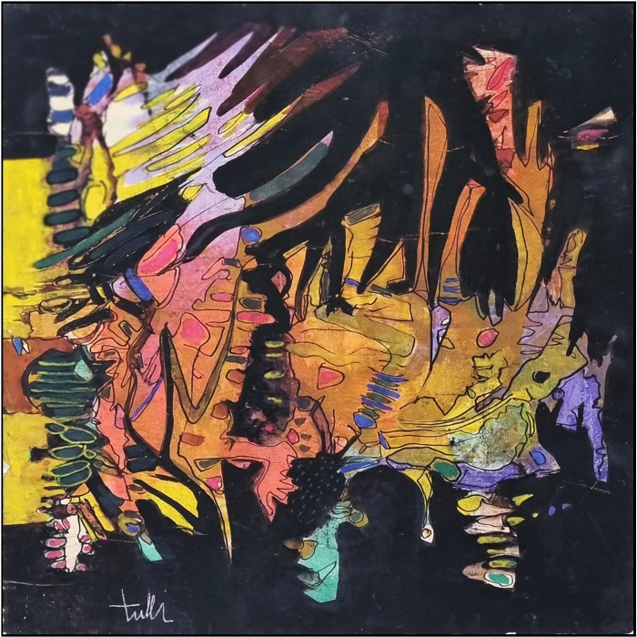 TULLI WLADIMIRO Macerata 1922 - 2003 "Animal presagio" Acrilici e tecnica mista su tavola cm 50x50. Firmato sul fronte in basso a sinistra. Sul retro firma, anno e titolo. (Piccole mancanze sul bordo perimetrale).