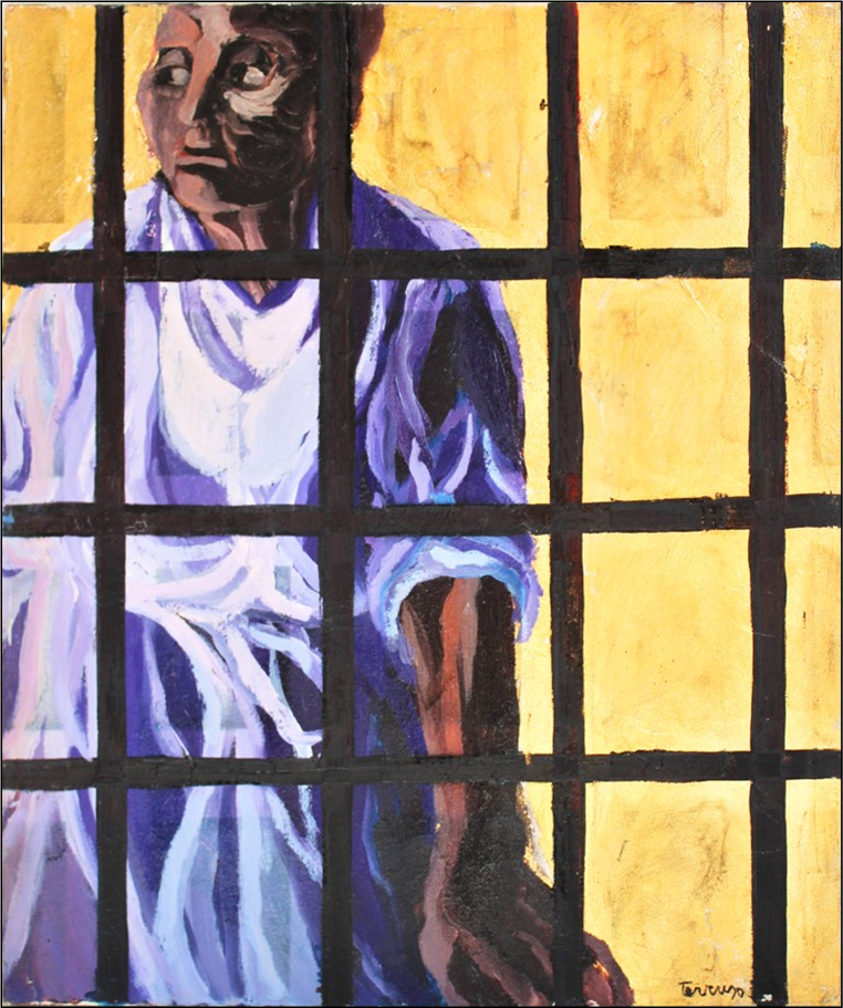 TERRUSO SAVERIO Monreale 1939 - Milano 2003 "Donne dietro le sbarre" Olio su tela cm 50x60 del 1975. Firmato sul fronte in basso a destra. Sul retro firma, titolo e anno.