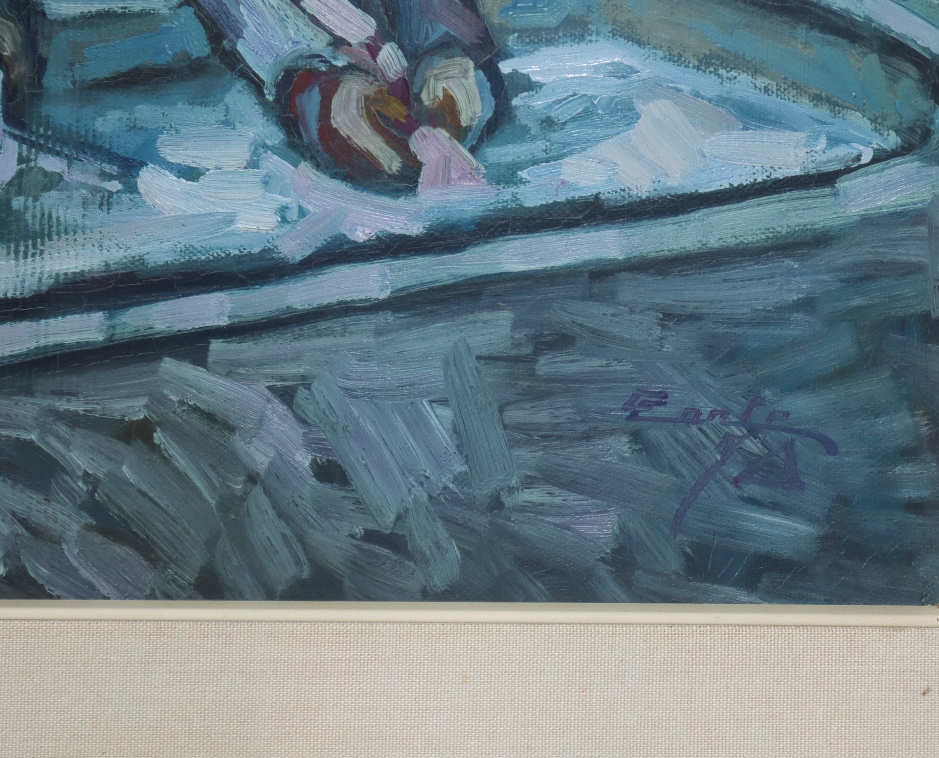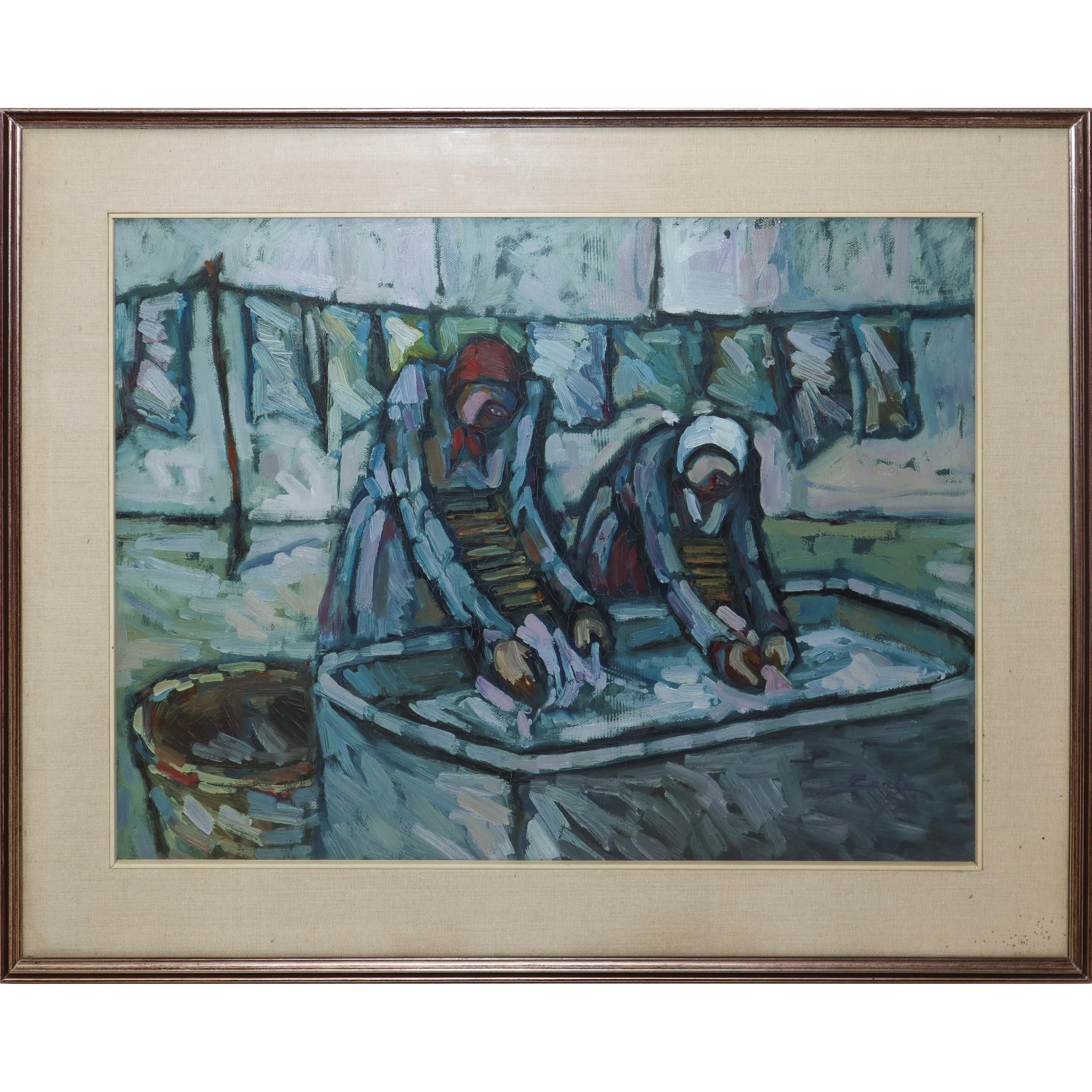 Carmelo Conte (Latiano 1946) - Lavandaie, 1970 cm 46x60 in cornice cm 59x74 Olio su tela Firmato in basso a destra. Dedicato e datato sul retro