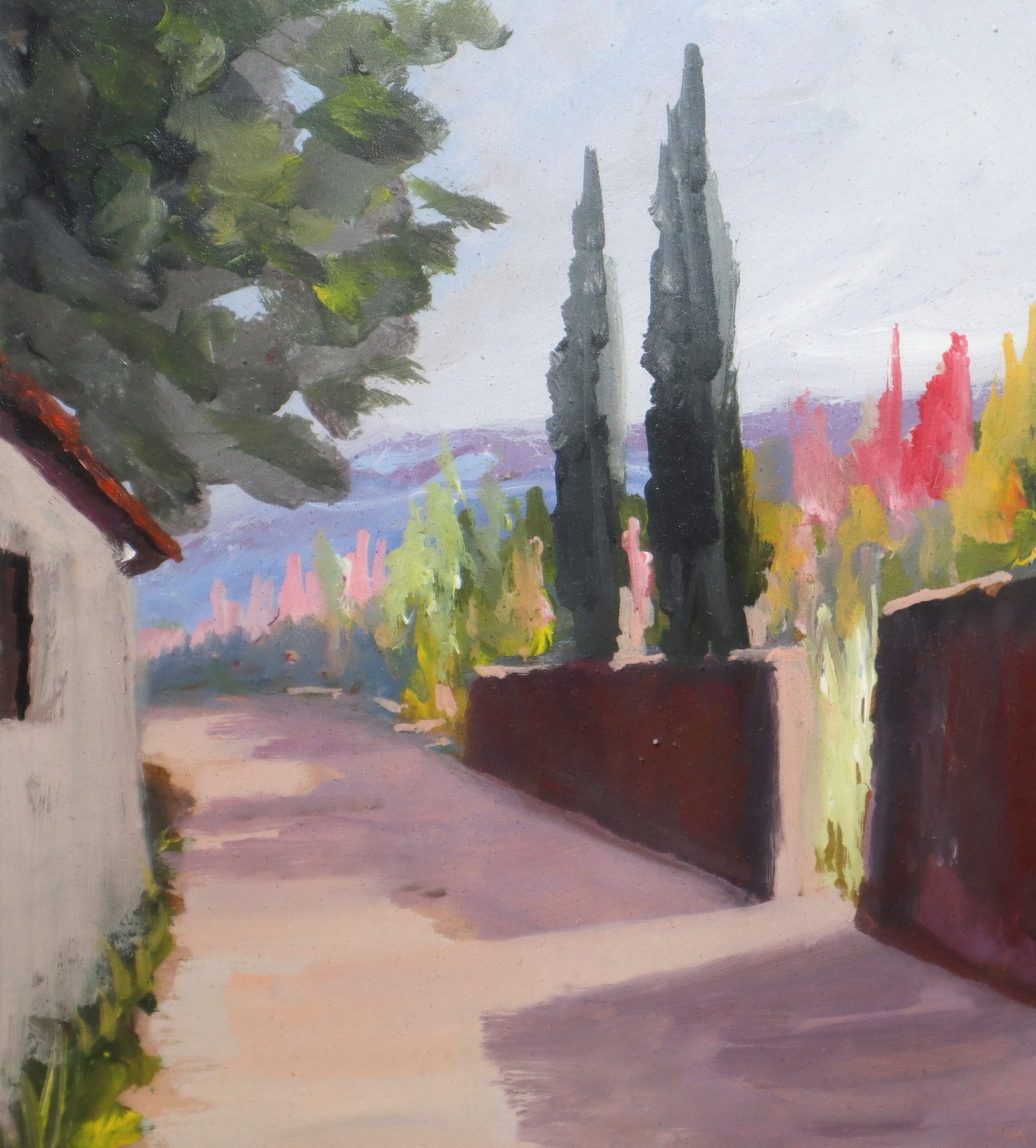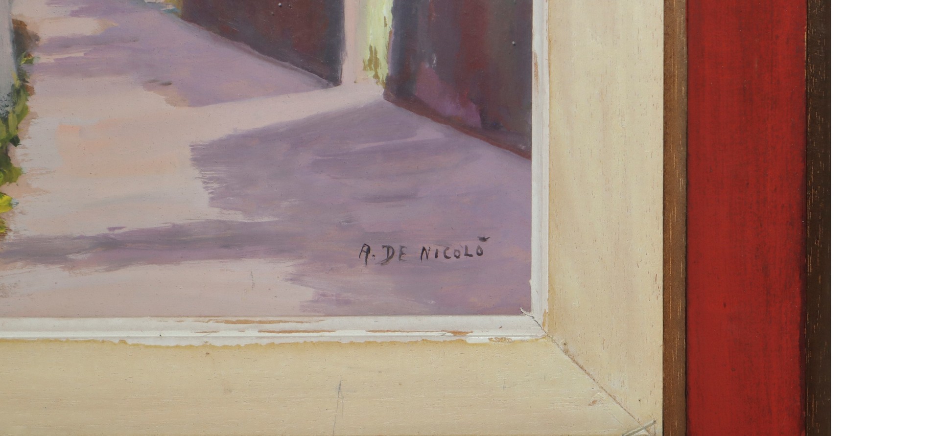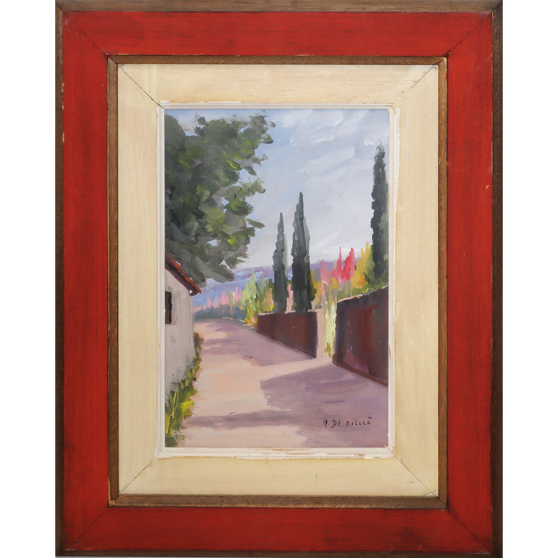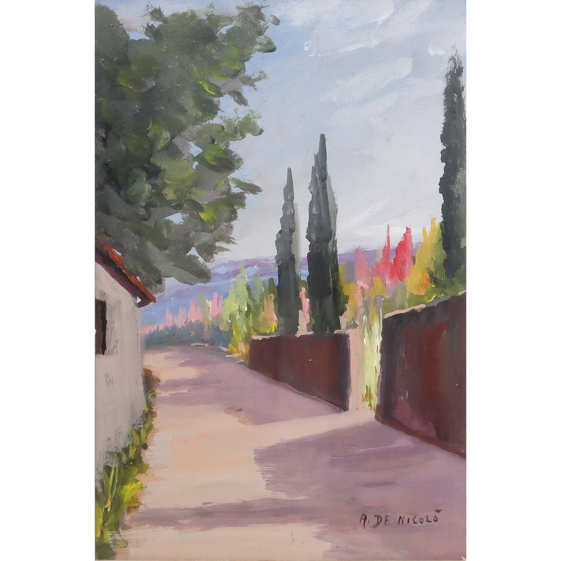 Strada con cipressi cm 30x20, in cornice cm 47,5X37,5 Olio su cartone telato Firmato De Nicolò