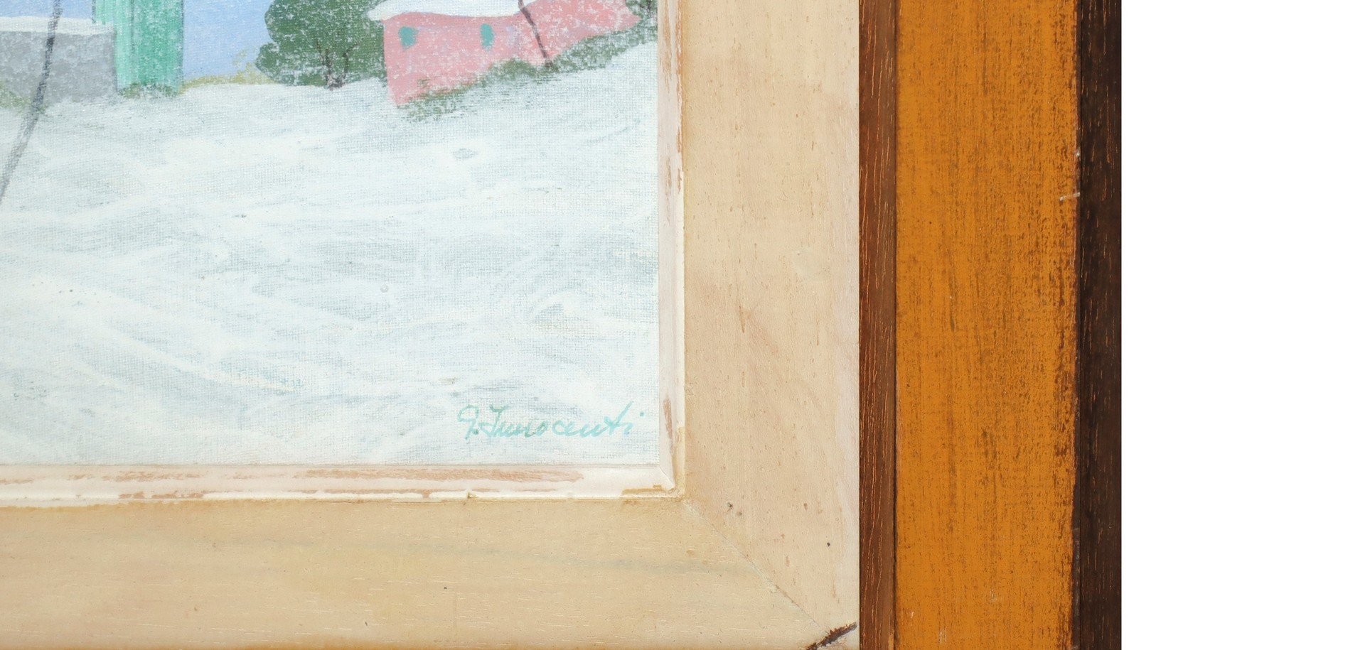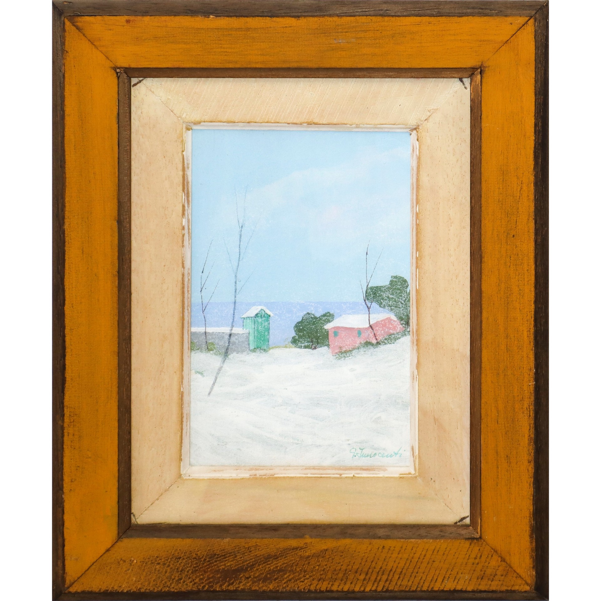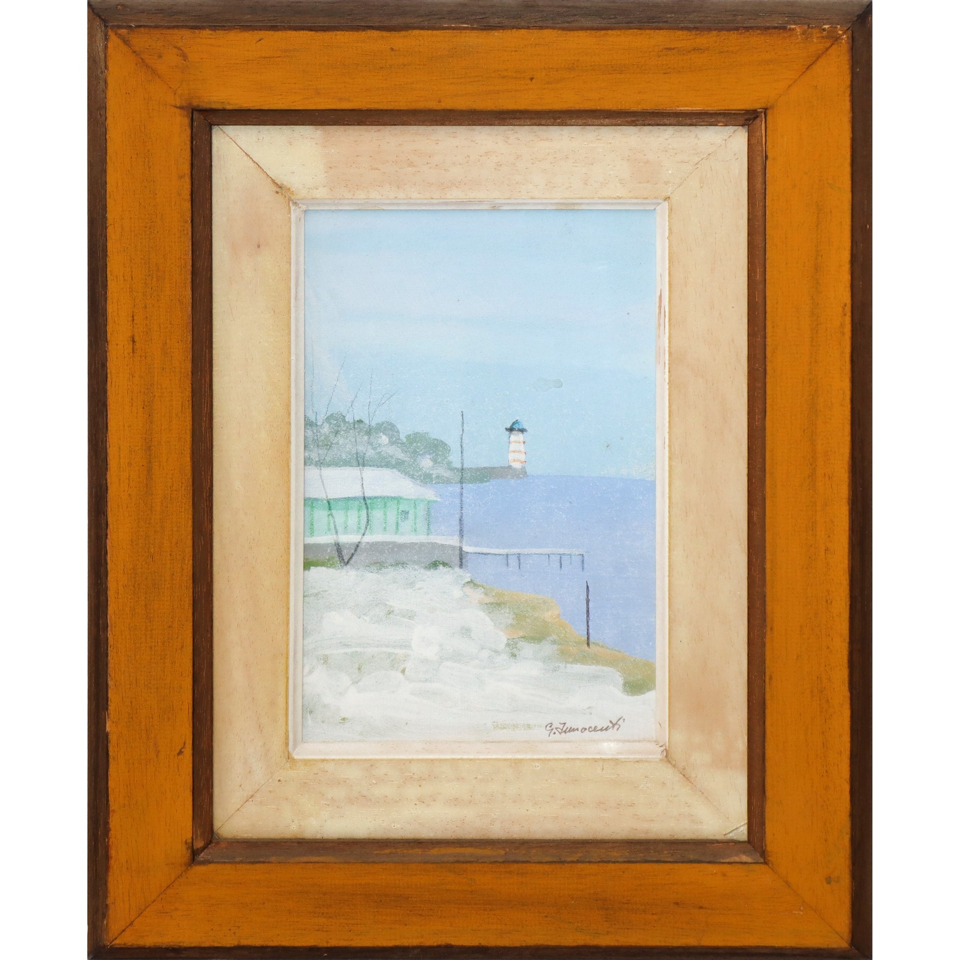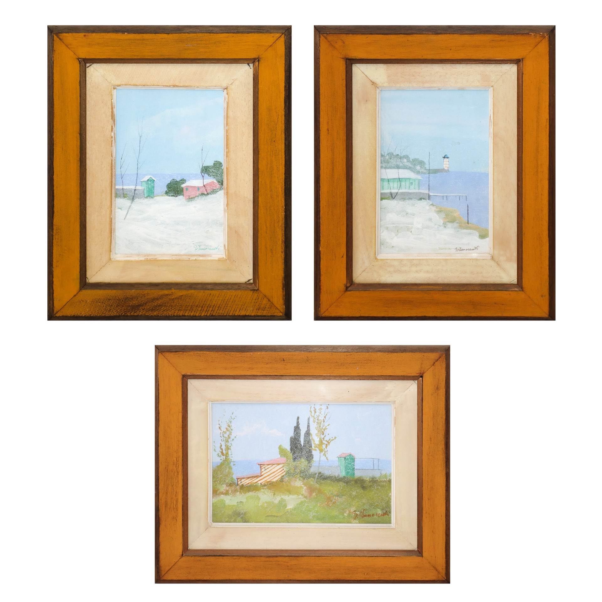 Trittico di dipinti, Faro, Paesaggio innevato sul mare, paesaggio con alberi sul mare Due dipinti cm 25x17, in cornice 42x34, uno cm 20x30 in cornice 37x47 Olio su cartone telato