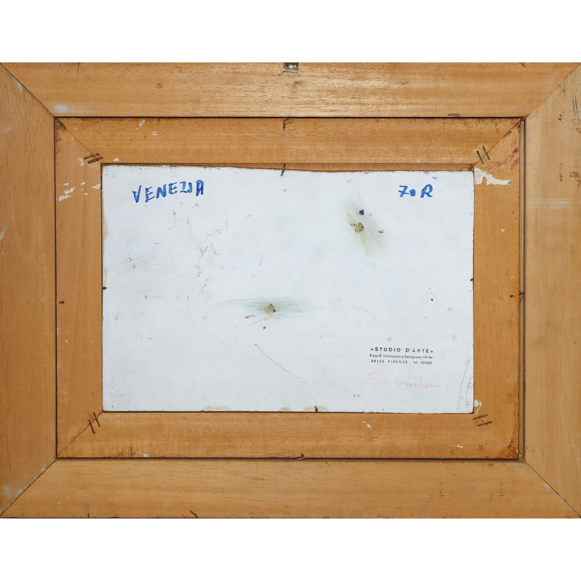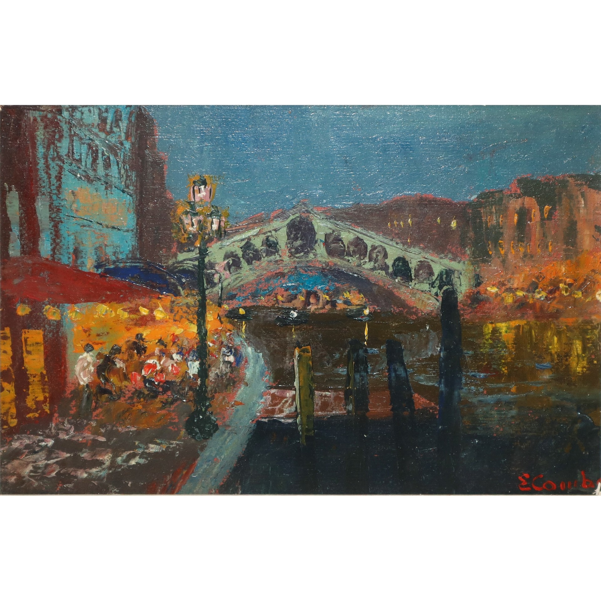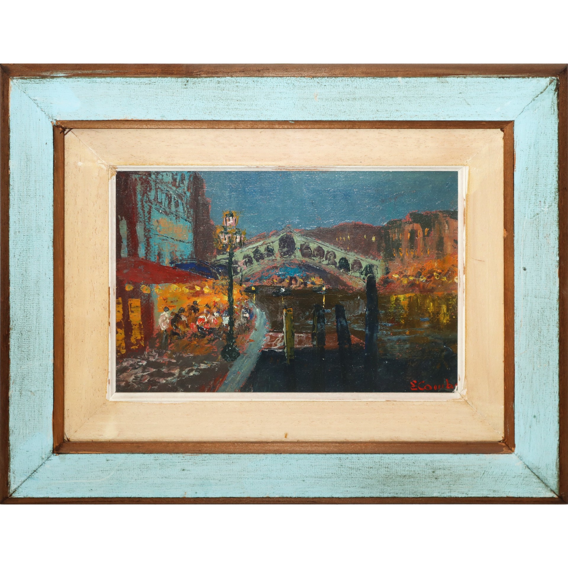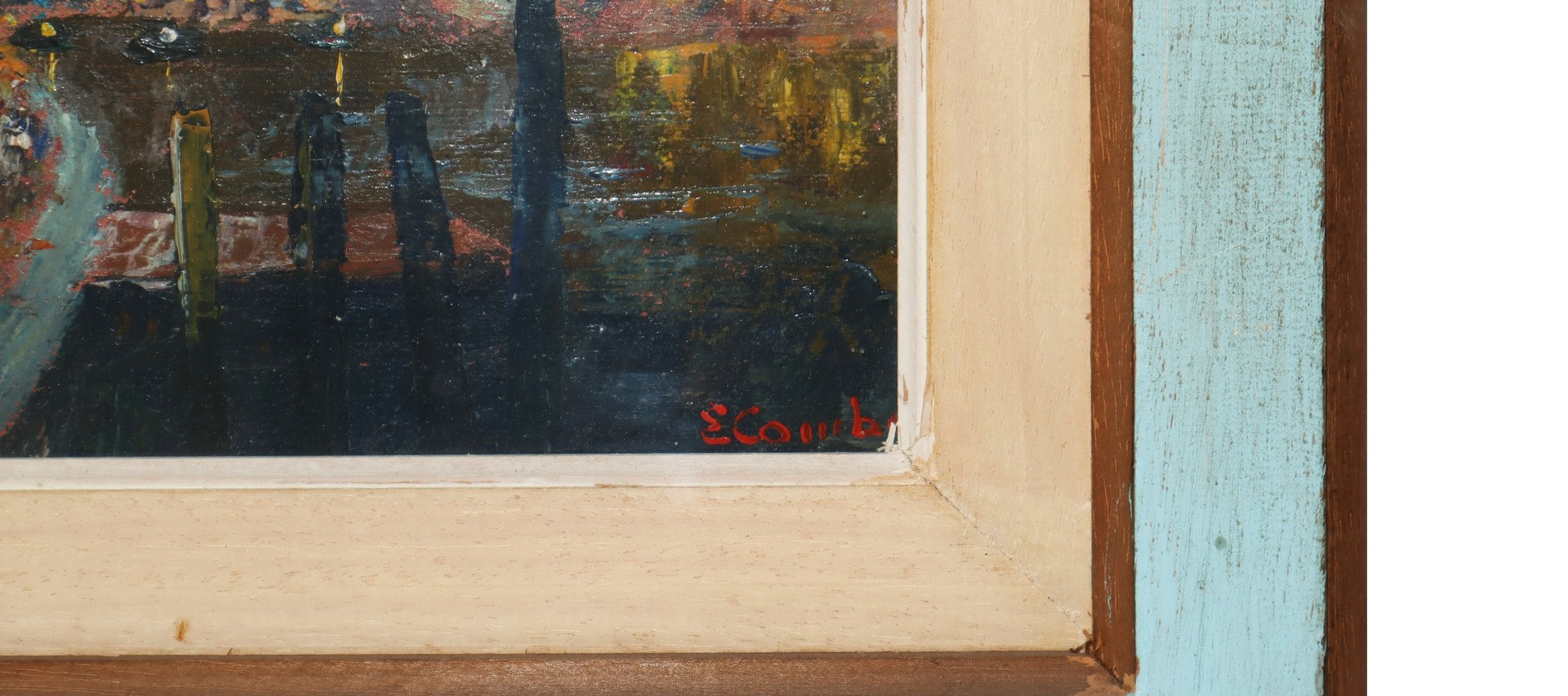 Emilio Comba (1939-1904) - Coppia di paesaggi, Notturno di Venezia e Ponte di Rialto, Marina con barche a secco cm 20x30, in cornice cm 38x37,5 Olio su compensato Firmato in basso a destra