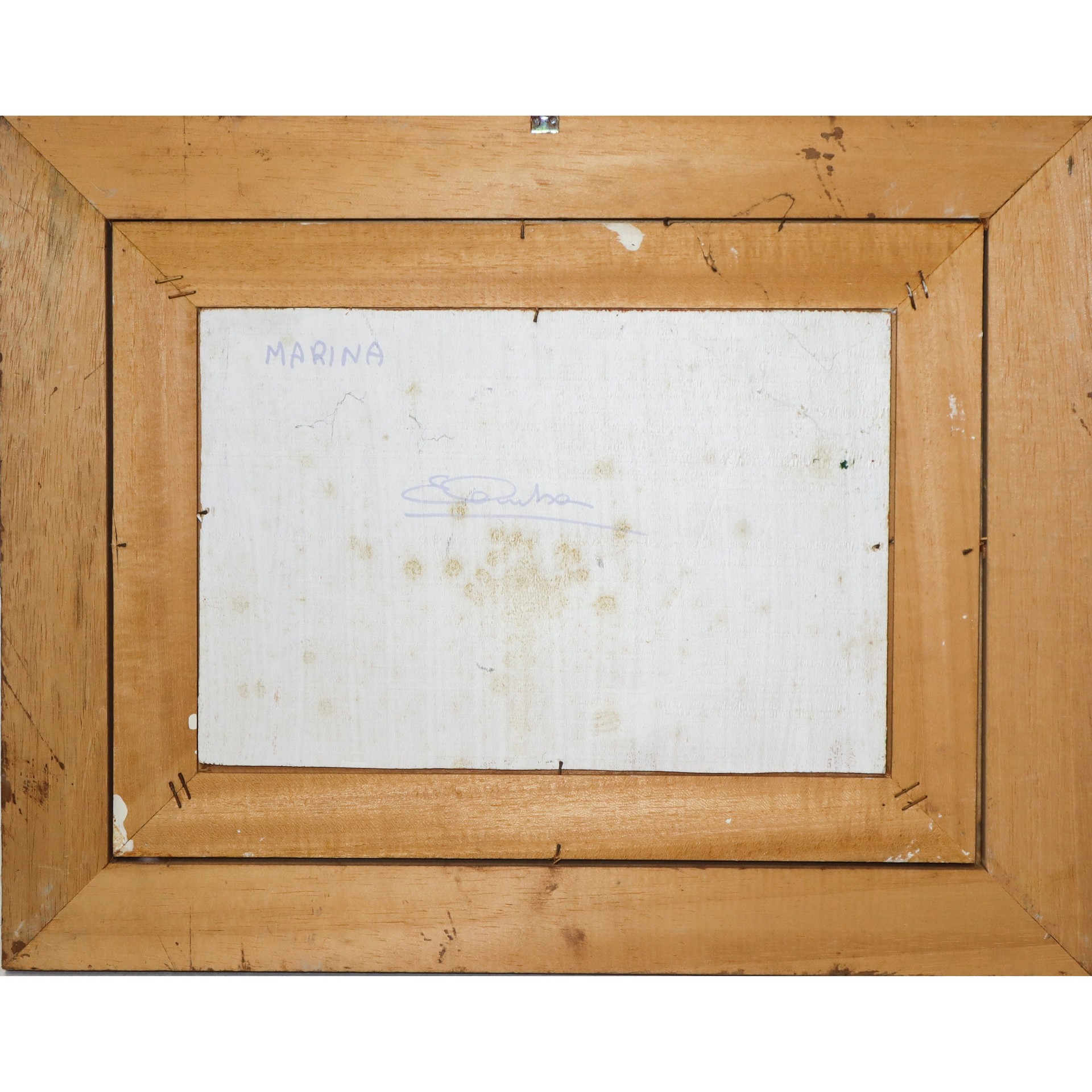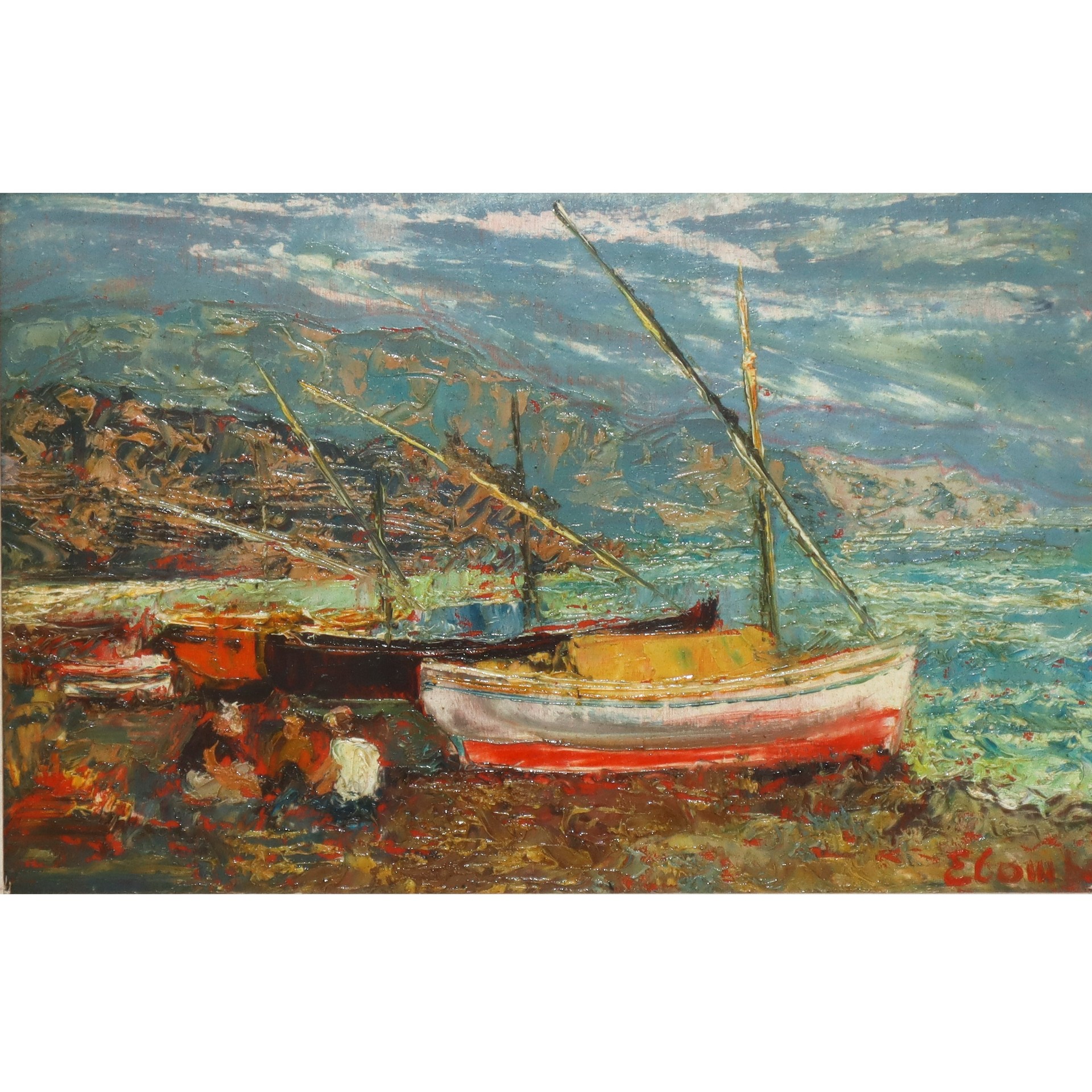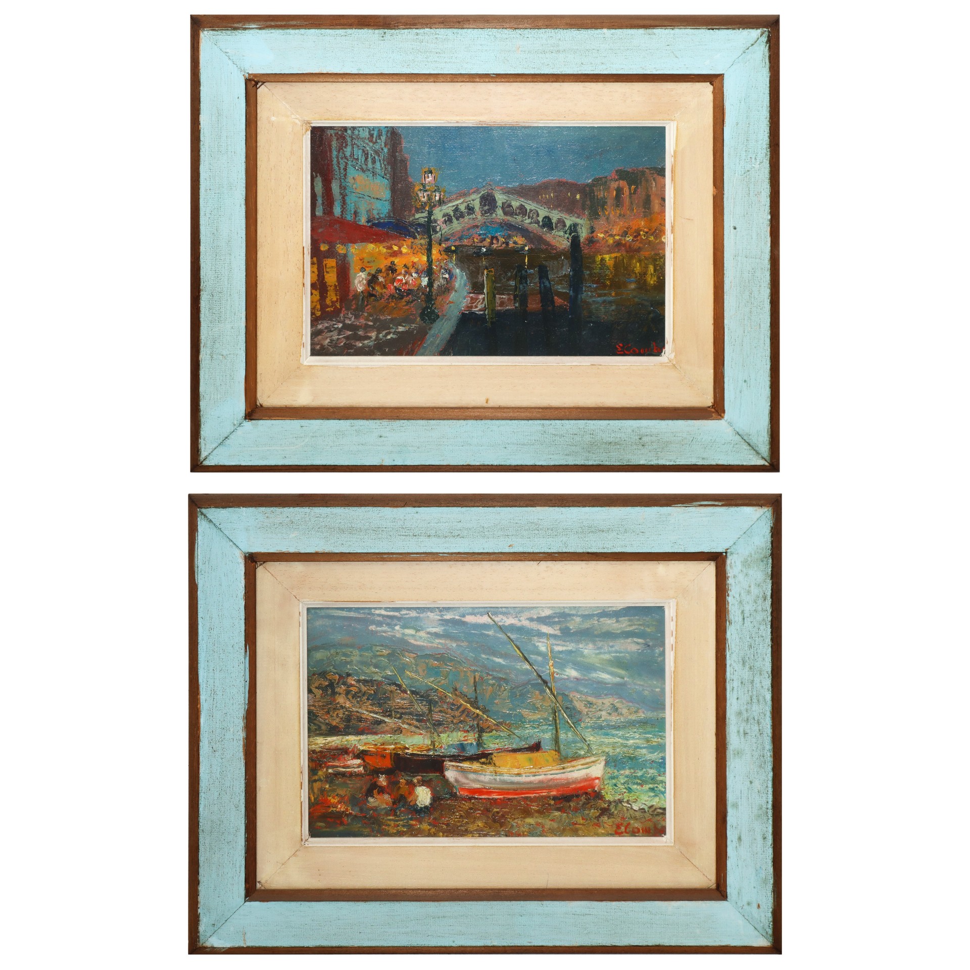 Emilio Comba (1939-1904) - Coppia di paesaggi, Notturno di Venezia e Ponte di Rialto, Marina con barche a secco cm 20x30, in cornice cm 38x37,5 Olio su compensato Firmato in basso a destra
