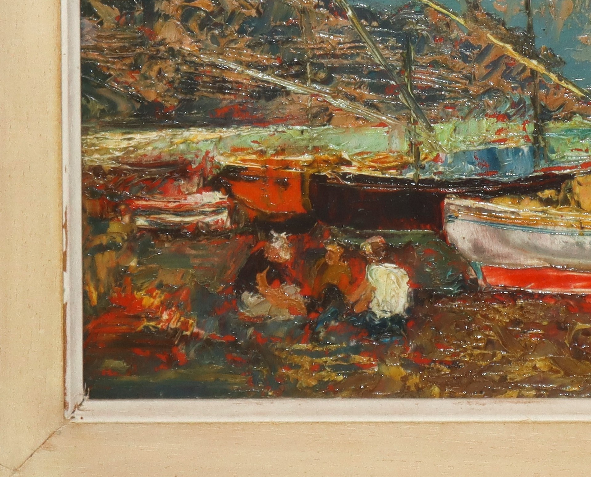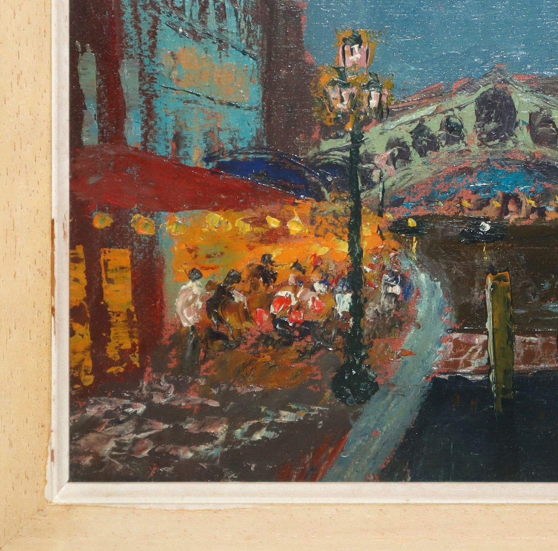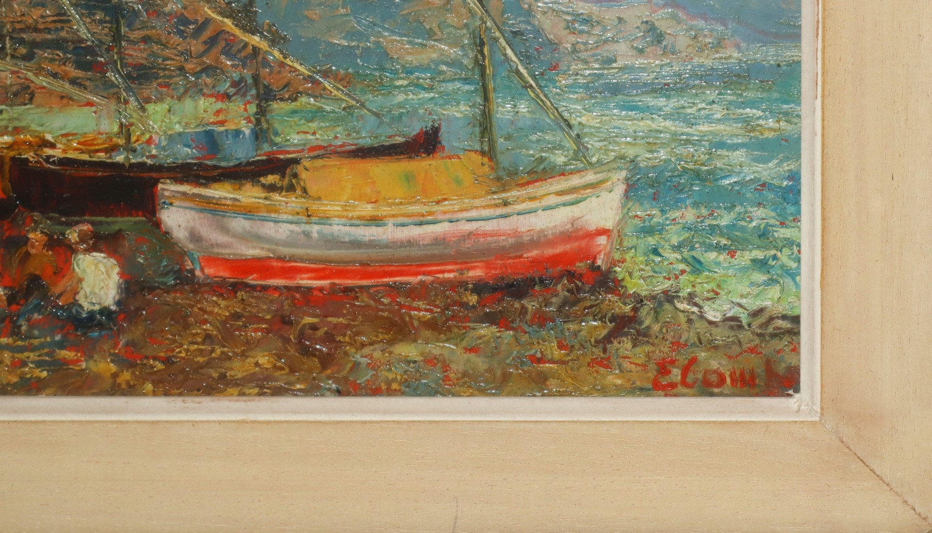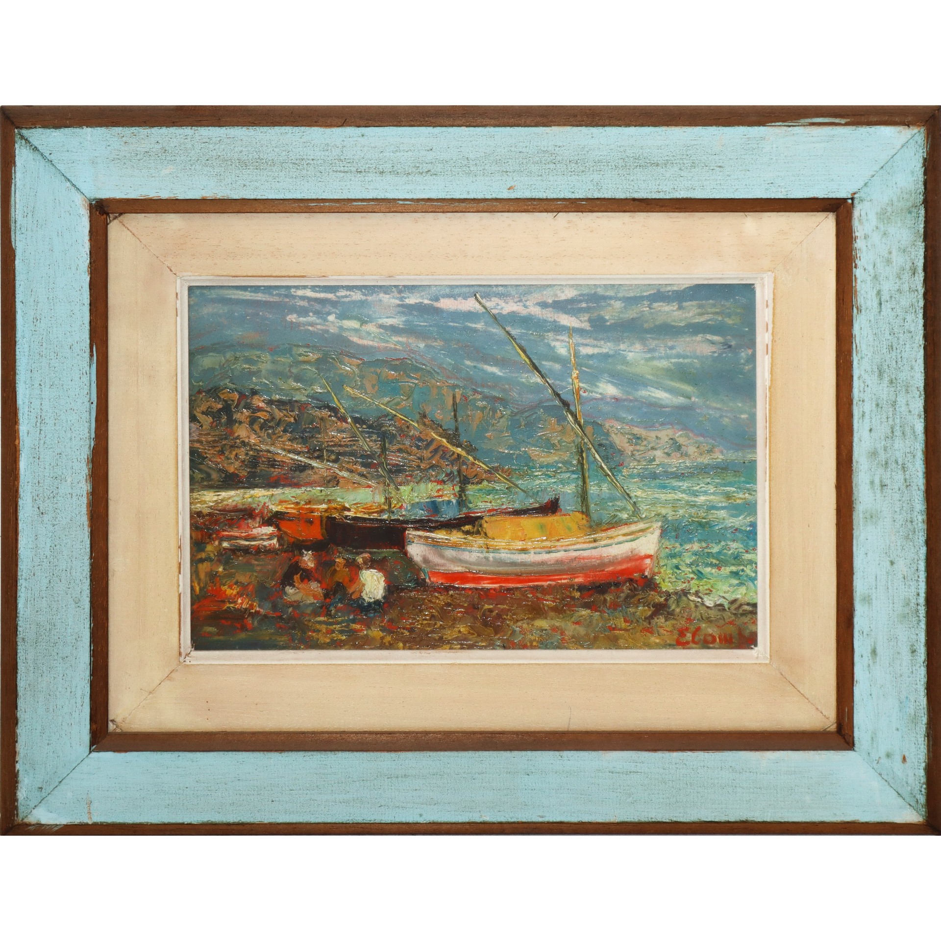 Emilio Comba (1939-1904) - Coppia di paesaggi, Notturno di Venezia e Ponte di Rialto, Marina con barche a secco cm 20x30, in cornice cm 38x37,5 Olio su compensato Firmato in basso a destra