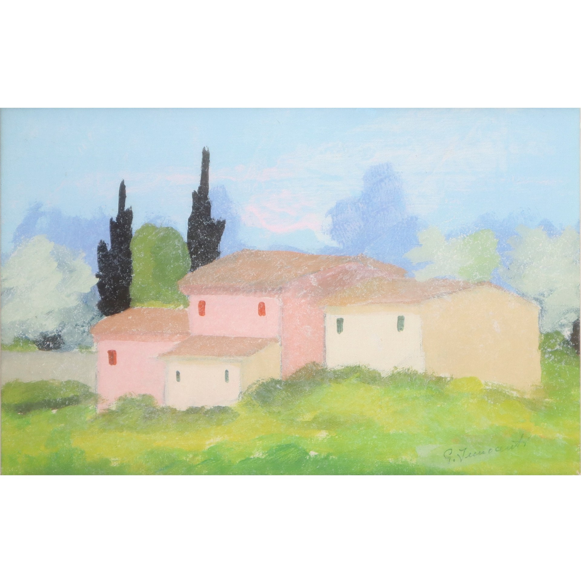Giuseppe Innocenti (Scarperia di Mugello) - Coppia di Dipinti, Paesaggio con case innevate, Paesaggio con case e cipressi