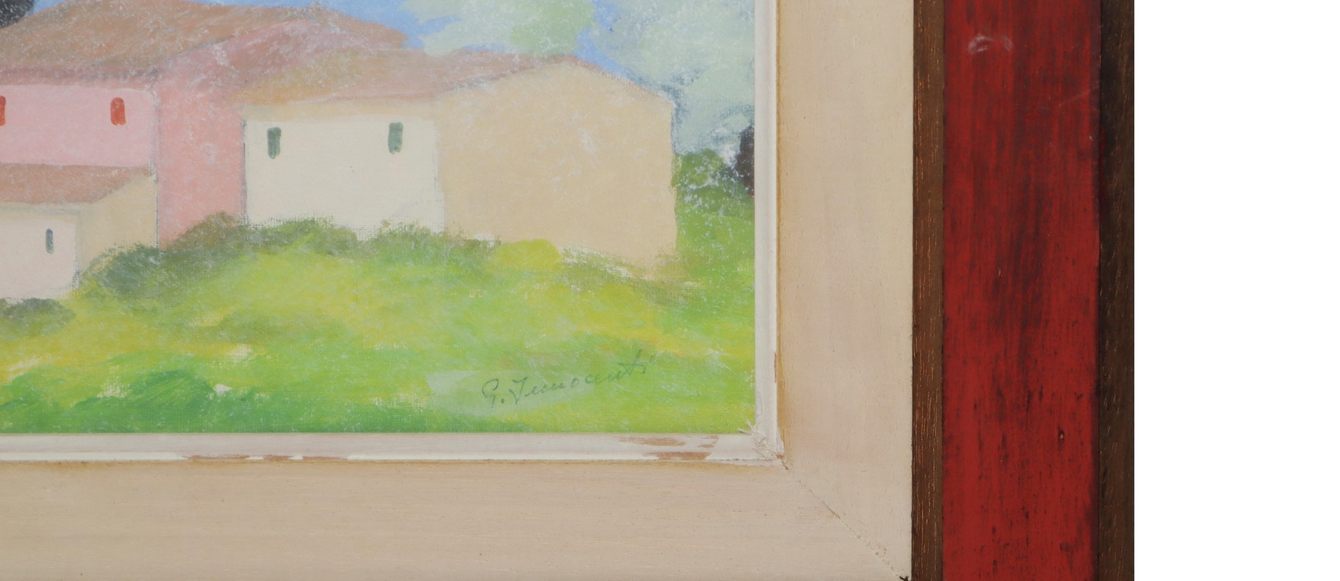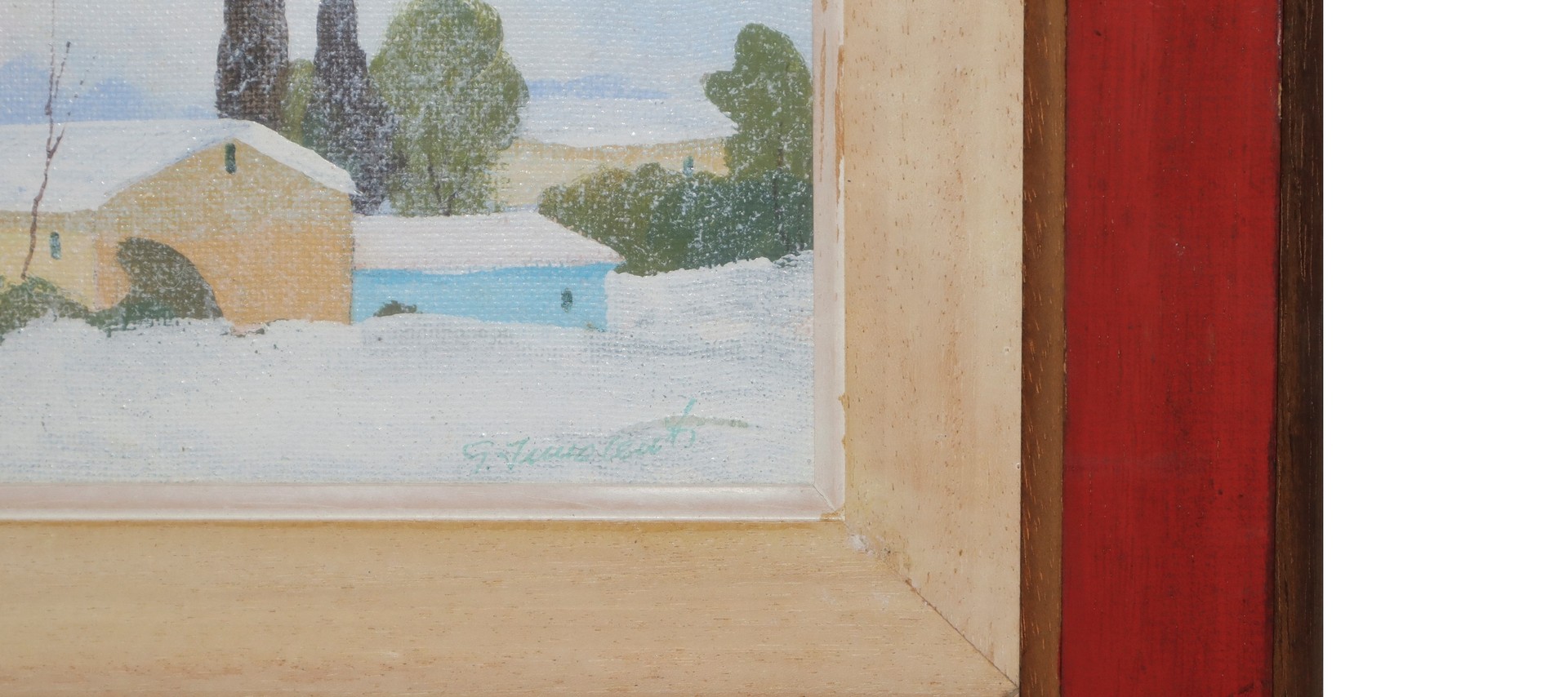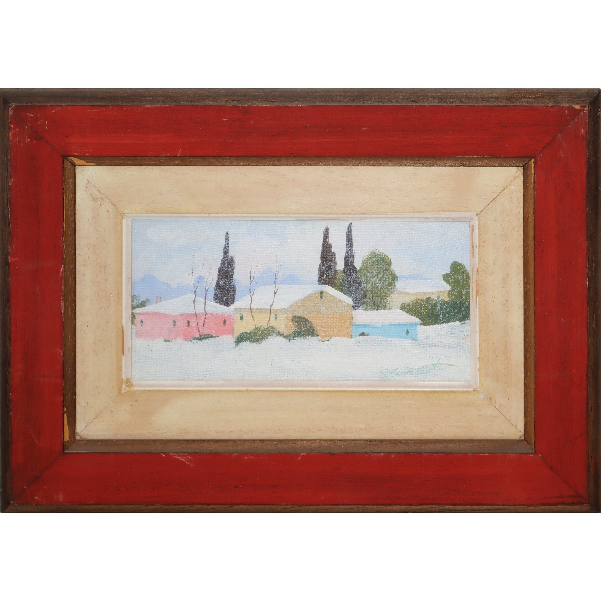Giuseppe Innocenti (Scarperia di Mugello) - Coppia di Dipinti, Paesaggio con case innevate, Paesaggio con case e cipressi cm 13x25 in cornice cm 30,5x42, cm 20x30 37,5x47,5 olio su cartone telato, olio su faesite