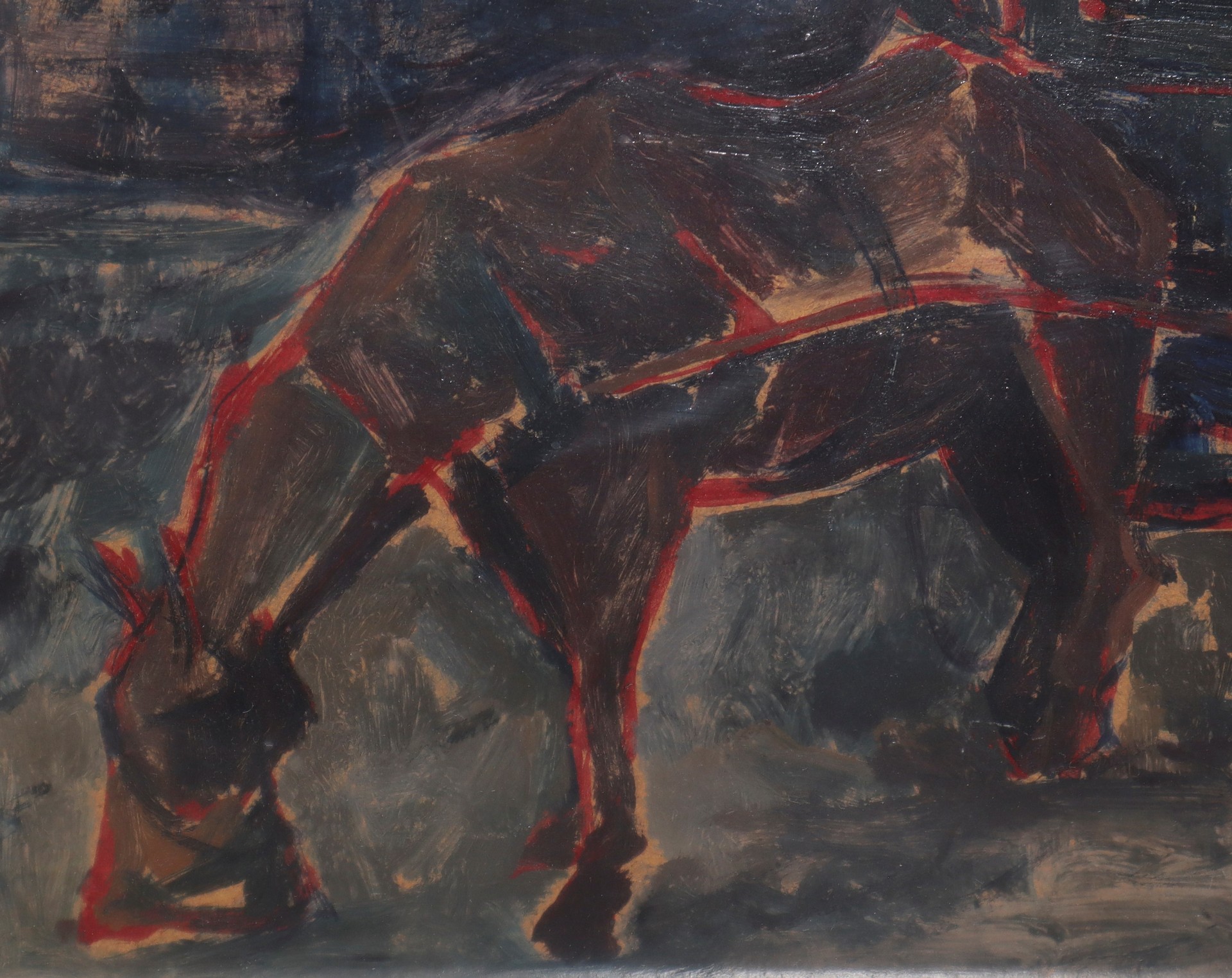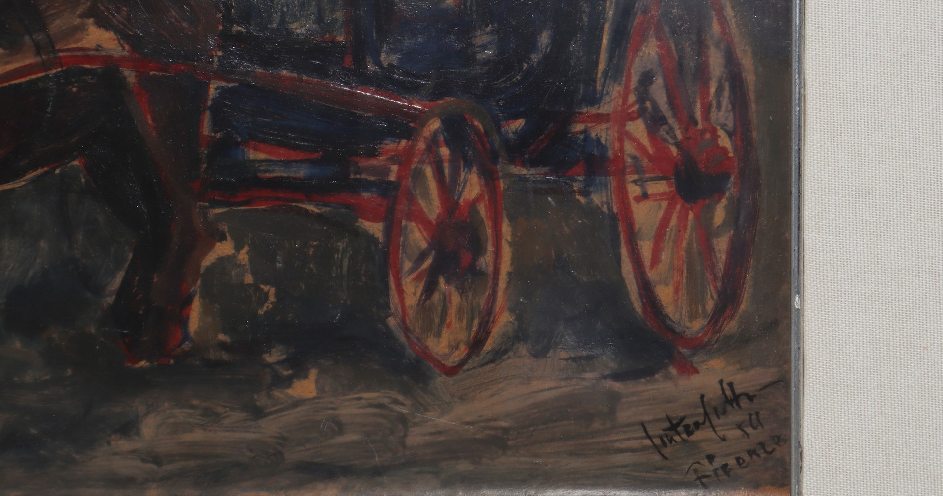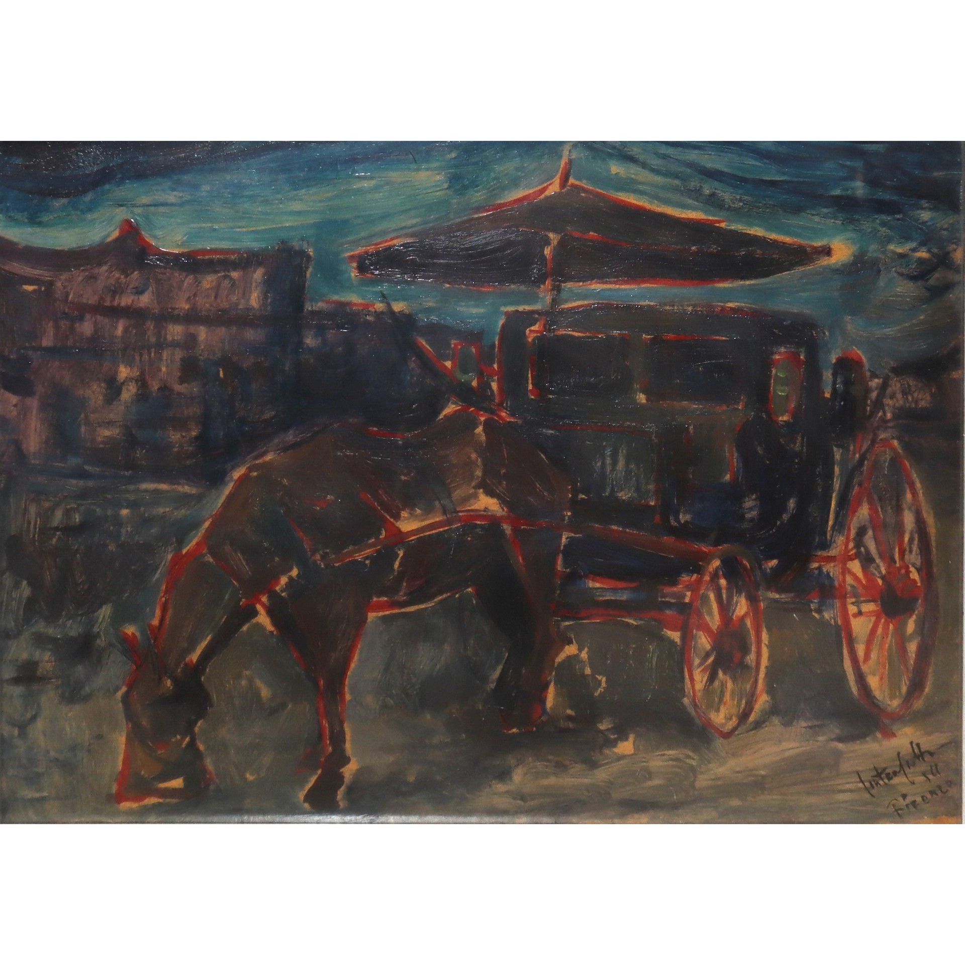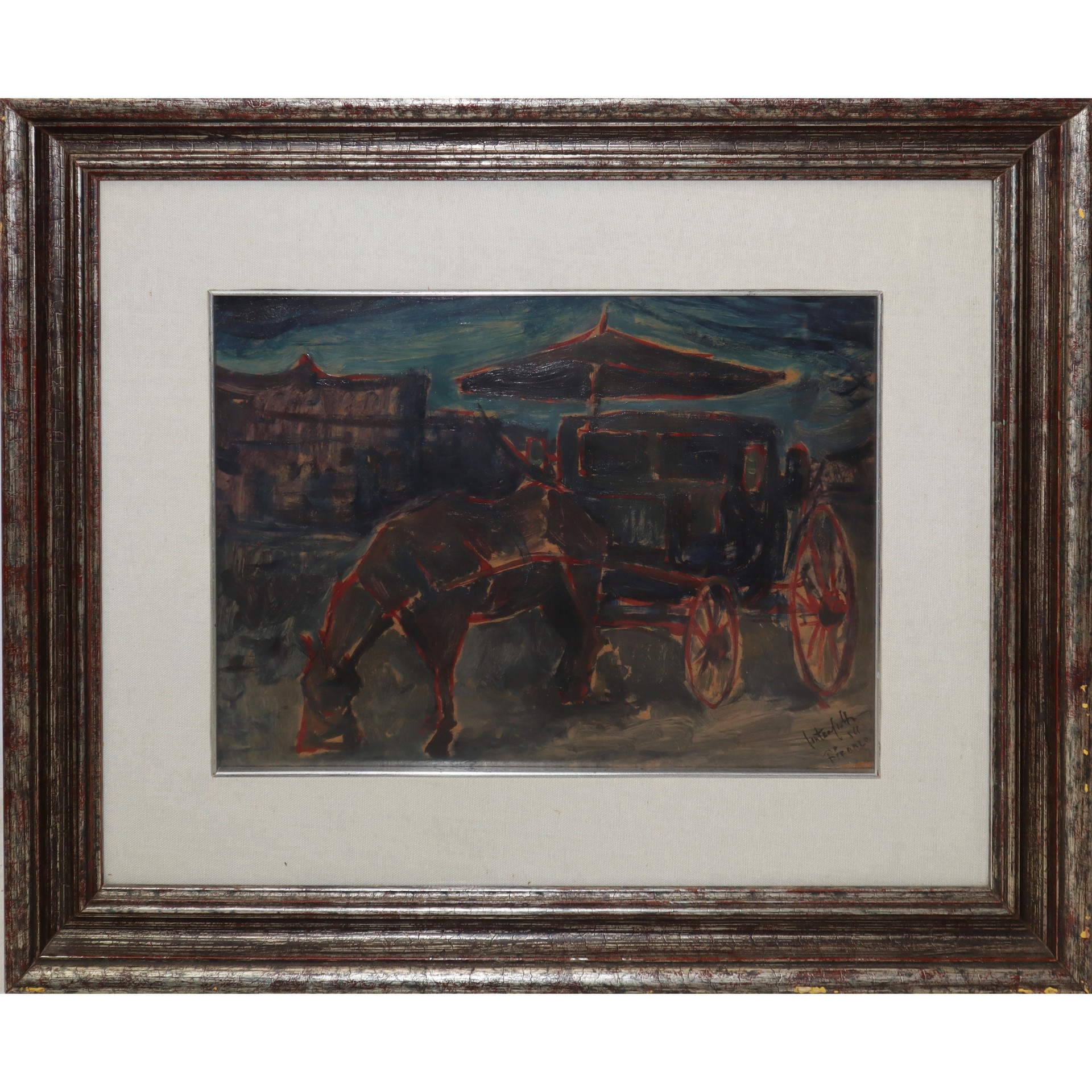 Francesco Contrafatto (Catania 1928-Catania 2015) - Carrozza con ombrellone cm 31x41, in cornice cm 53 x64 Olio su masonite Firmato in basso a destra Contraffatto 54, Firenze