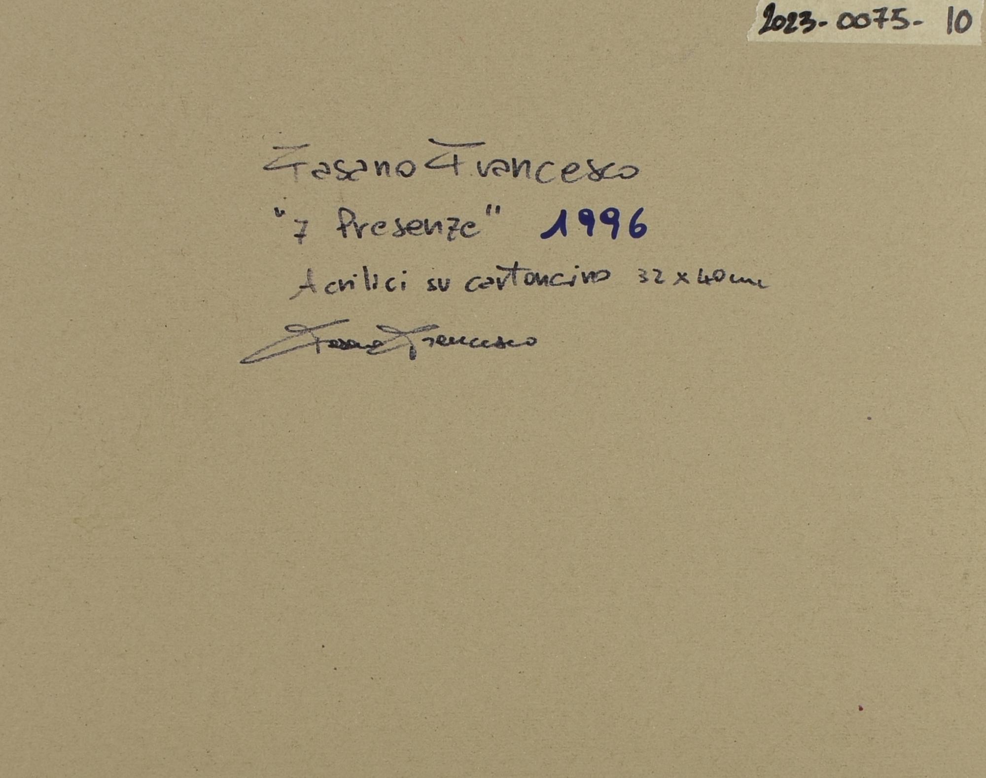 Francesco Fasano 7 PRESENZE acrilico su cartoncino, cm 32x40 sul retro:...
