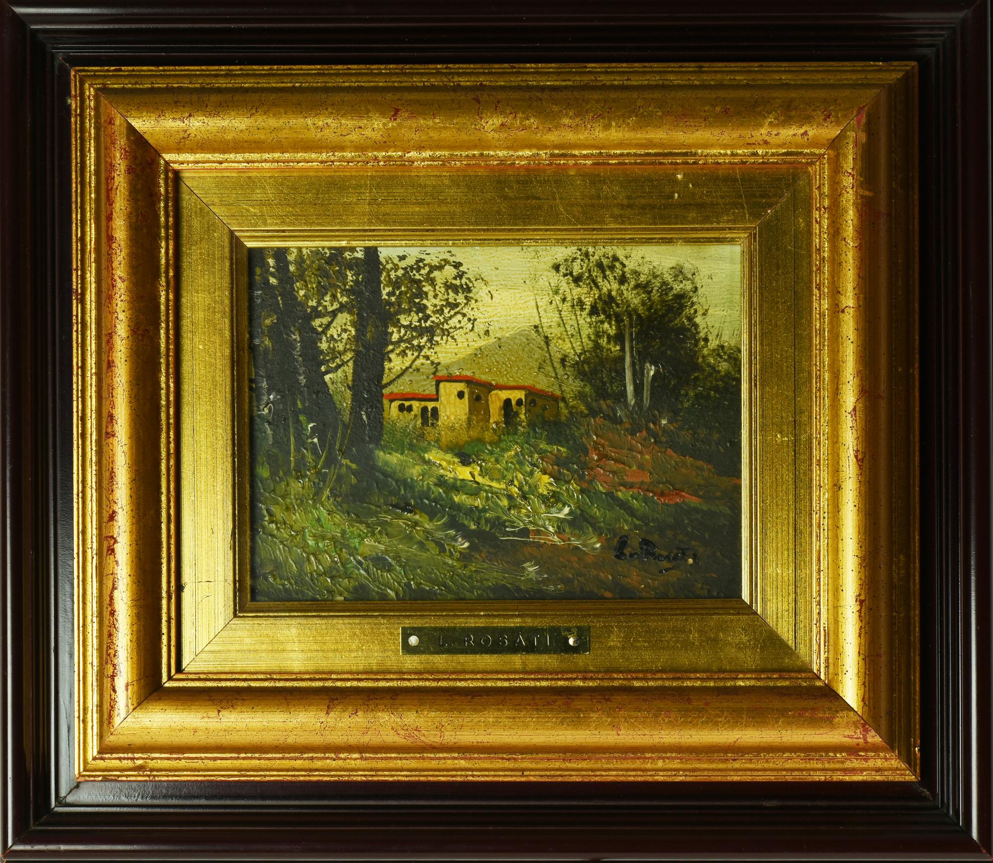 Luigi Rosati LA CASA NEL BOSCO olio su masonite, cm 12,5x17 firma