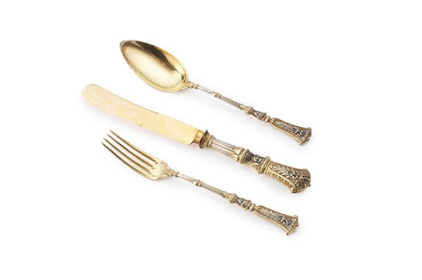 Servizio di posate in vermeil con decoro a mascheroni e volti muliebri composto da : diciotto forchette, diciotto coltelli e diciotto cucchiai. Titolo 800. Germania, inizio secolo XX (g netti 1550) (lievi difetti)