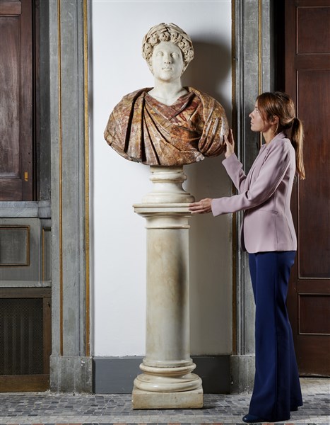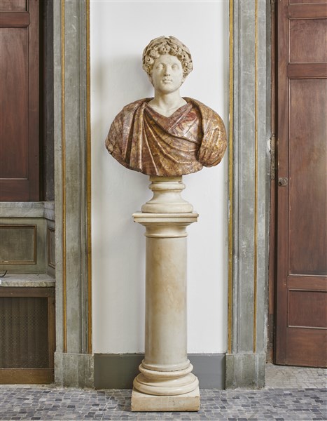 Sculptor of the late 18th century - beginning of the 19th century. "Marcus Aurelius Caesar", statuary marble and breccia bust (h. 97 cm) resting on marble column with square base of later period (h. 110 cm) (defects and small restorations)
