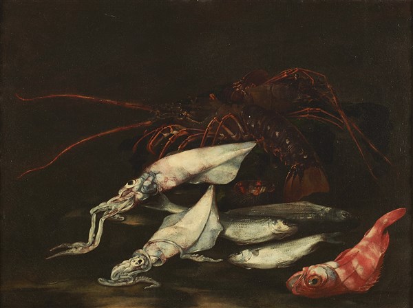 Giuseppe Recco "Composizione con aragosta, calamari e pesci" olio su tela (cm 72