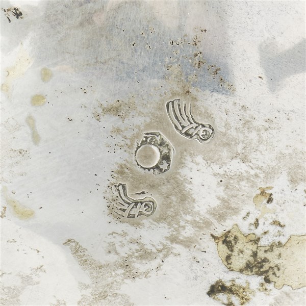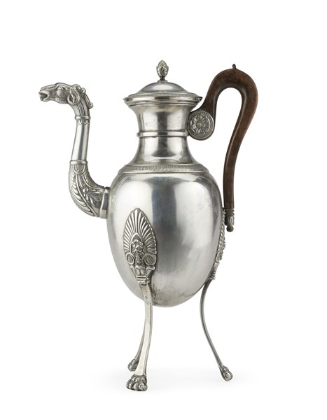 Teiera in argento a corpo liscio, presa a pigna a tutto tondo, versatoio a testa di ariete, gambe ferine decorate all'attacco da mascheroni, ansa in legno sagomato. Venezia, prima metà secolo XIX (h. cm 33) (g lordi 1000) (difetti)