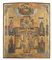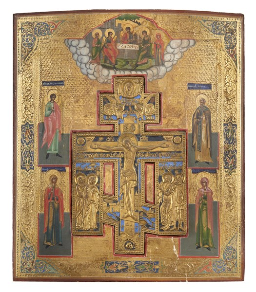 19th-century Russian art. Bronze and enamel cross-shaped reliquary, wooden panel depicting saints on a gold background (cm 35.5x31) (defects)