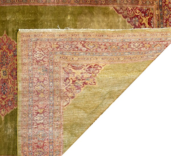 Tappeto Mahal, Persia, fine secolo XIX. Decoro con piccolo medaglione polilobato a fondo rosso su campo tinta unita color verde oliva. Bordura Herati su fondo rosso (cm 375x249) (difetti e rapature)