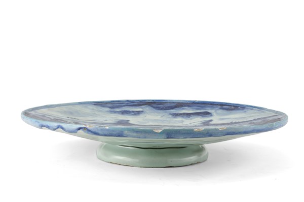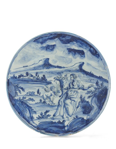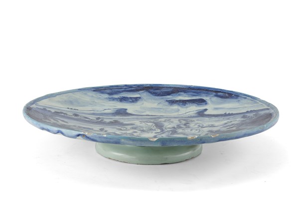 Manifattura ligure, secolo XVIII. Alzata in maiolica dipinta in monocromia blu con Allegoria dell'Abbondanza entro paesaggio. Marcata con lanterna al retro (d. cm 30; h. cm 5,5) (sbeccature e restauri)