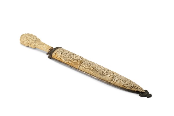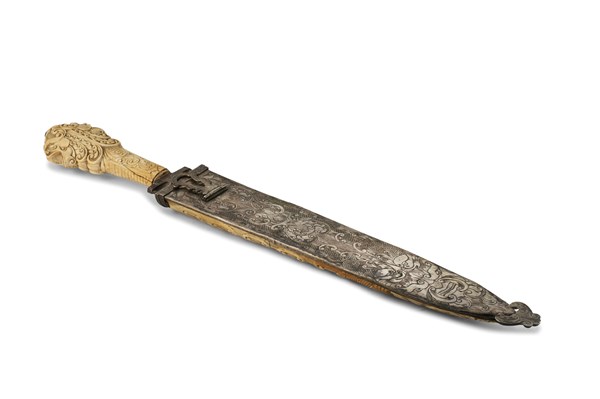 Daga decorativa, secondo quarto del secolo XIX. Importante manico scolpito in avorio con motivo di girali ed animali fantastici. Forte lama a lingua di bue, doppio sguscio con nervatura centrale e leggero rinforzo in punta. Fodero con tre blocchi di avorio scolpiti con girali, mascheroni e mostri marini. Al retro placca in argento inciso con il medesimo decoro. Gancio di attacco con punzoni di Venezia e del Lombardo Veneto (L. cm 58) (difetti e restauri)