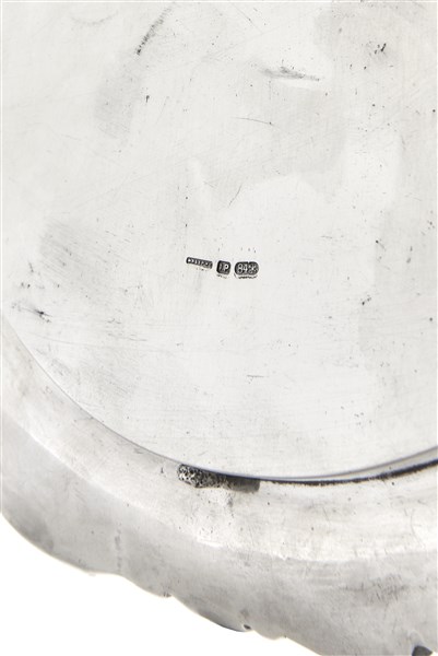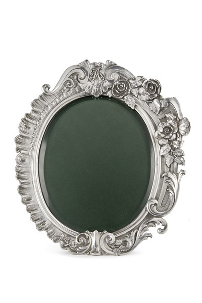 Julius Rappoport per Fabergé (Kovno 1851 - San Pietroburgo 1917) Cornice portafoto in argento di forma ovale cesellata a rose, foglie e volute e monogramma "AF" (Imperatrice Alexandra Feodorovna?) (cm 27x22) (g 700) (lievi difetti)