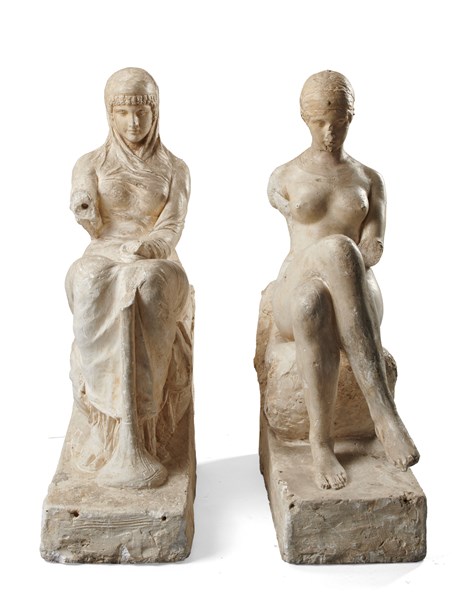 Pair of preparatory plaster casts depicting seated female figures, one bearing a double signature engraved on the base (26x97x67 cm; 23.5x95x64 cm) (defects and losses)