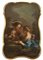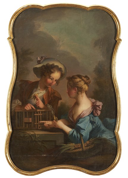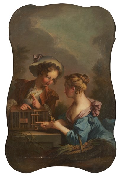 French school late eighteenth century "Gender scene with girls and birdcage" Oil on canvas shaped (cm 125x82,5) framed (minor defects)