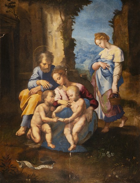 Da Giulio Romano, "Sacra Famiglia", olio su tela applicata su tavola (cm 103x78), in cornice (difetti e restauri)