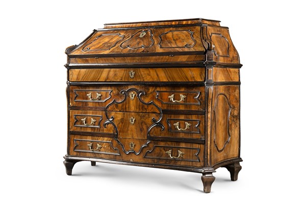 Ribalta di forma mossa lastronata in noce e radica di noce, cartelle in legno ebanizzato. Fronte a tre cassetti sotto uno a mezza lunghezza, calatoia celante sei cassettini, un tiretto sottopiano. Lombardia, secolo XVIII (cm 130x117x54) (mancanze e restauri)