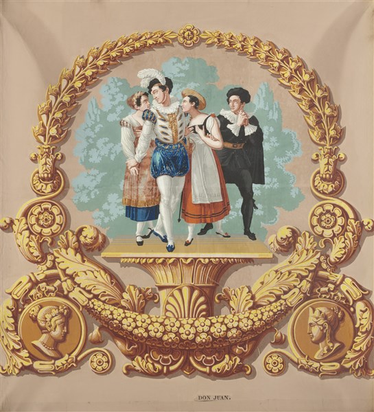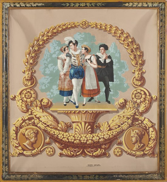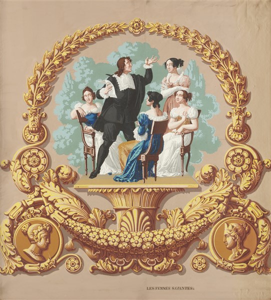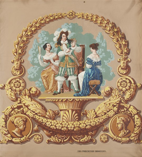 Scuola francese del secolo XIX. Gruppo di cinque papier peint raffiguranti soggetti delle opere di Molière (cm 80x70 ca.) In cornici (difetti)