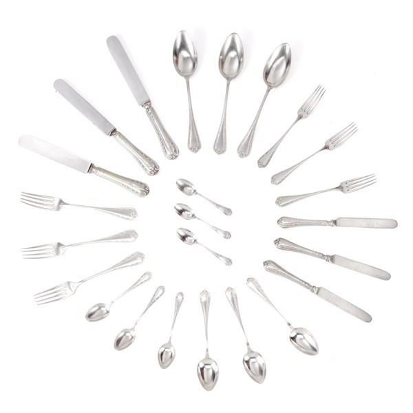 Part of silver cutlery comprising: twenty-five forks, twenty-four knives and twelve spoons, thirteen forks and twelve fruit knives, twelve medium spoons and fourteen dessert spoons joined to a cheese spoon and six coffee spoons of similar decor. Title 800 (g net 3880) (minor defects)