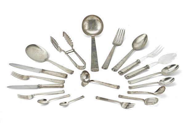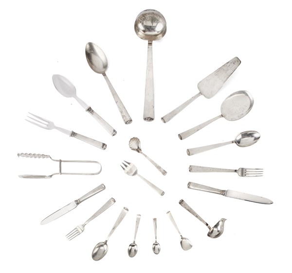 Parte di servizio di posate in argento composto da : diciotto forchette, dodici cucchiai, diciannove coltelli, diciotto forchette, undici cucchiai e diciassette coltelli da dessert, dodici cucchiaini da gelato, nove cucchiaini da tè e undici da caffè, un mestolo e undici posate da portata. Titolo 800. Bologna, 1950 ca., argentiere Clementi (g netti 4900) (difetti)