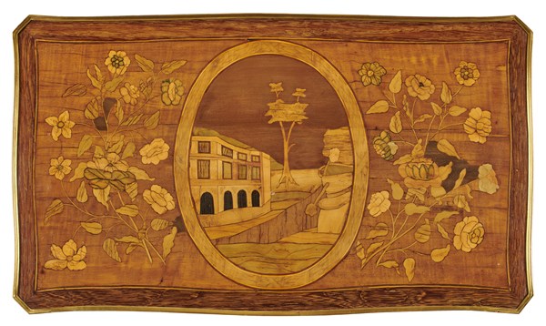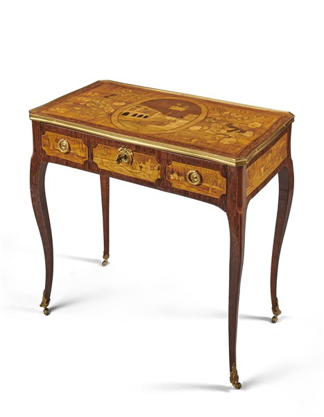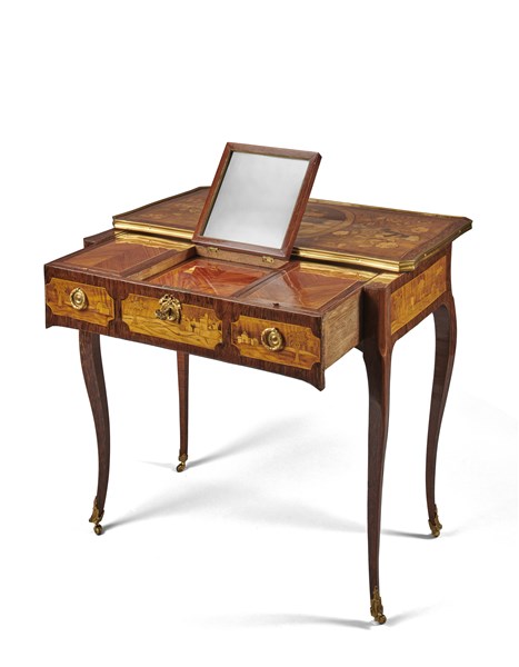 Toilette lastronata ed intarsiata in amaranto, bois de rose e legni vari con piano scorrevole bordato in bronzo centrato da medaglione tra rami fioriti decorato da architetture, cassetto nella fascia intarsiata a paesaggi. Piano scorrevole tripartito con pianetto scrittoio, specchio e vani, piedi con rotelle. Francia, seconda metà secolo XVIII (cm 76x74x47) (difetti)