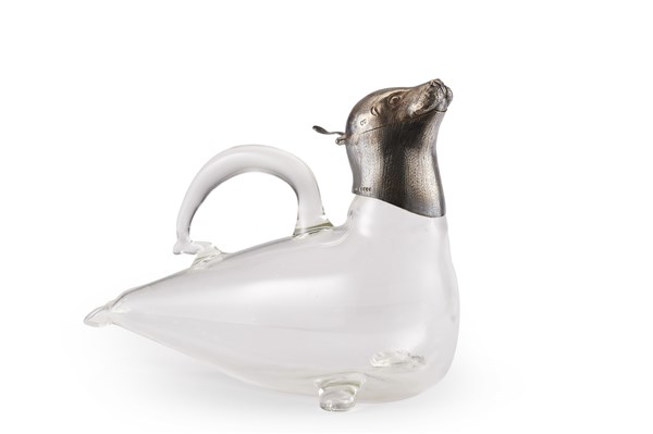 Seal-shaped ewer with glass body and silver head. London, 1881. Silversmith W.L. (cm 24x17 approx.) (minor defects)