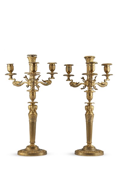 Coppia di candelabri in bronzo nello stile di Claude Galle a quattro fiamme, fusto scanalato reggente vaso decorato all'attacco da volti classici di cariatidi e poggiante su piedi antropomorfi. Bracci sagomati a forma di animali fantastici. Base circolare con bordi cesellati a valve di conchiglia e palmette (h. cm 49) (difetti)