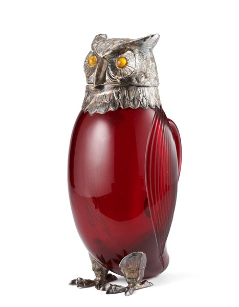 Ewer in the shape of an owl with red glass body and glass paste eyes. Silver head and claws, title 925. Spain, early 20th century (h. cm 28 approx.) (defects)