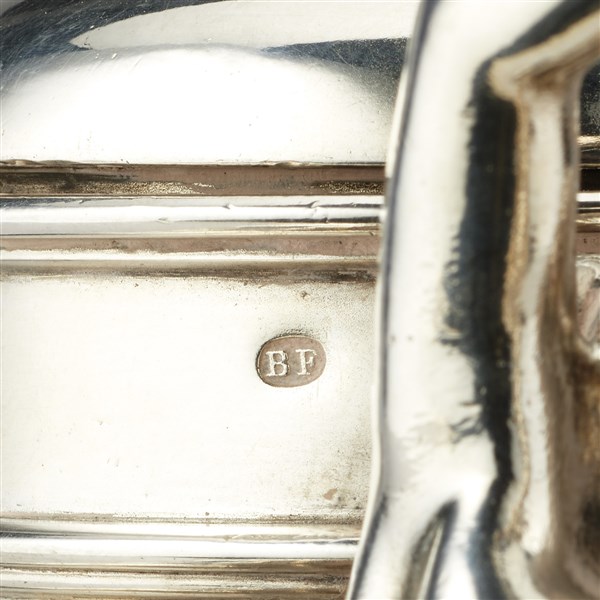 Caffettiera in argento con corpo ovoidale su base circolare, manico a doppia vo